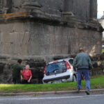 Incidenti stradali, auto finisce contro l’Arco d’Augusto dopo lo scontro con una moto