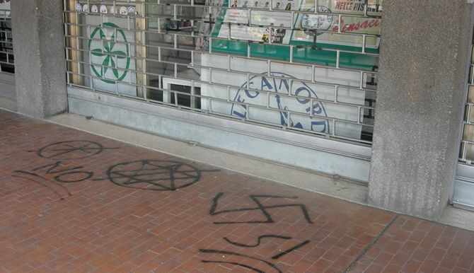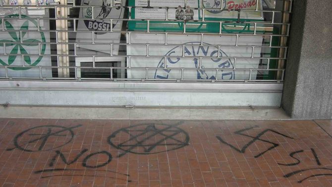 Una croce e una Stella di Davide, entrambe dentro cerchi e sbarrate, e una svastica: sono i simboli che sono stati fatti con bombolette spray davanti alla sede della Lega Nord Valle d'Aosta. Altri simboli dello stesso tenore sono stati trovati nel parcheggio e nel porticato adiacenti. Sul fatto indaga la Digos. Secondo una prima interpretazione, gli autori del gesto avrebbero voluto contestare cattolicesimo ed ebraismo e sostenere l'arianesimo.