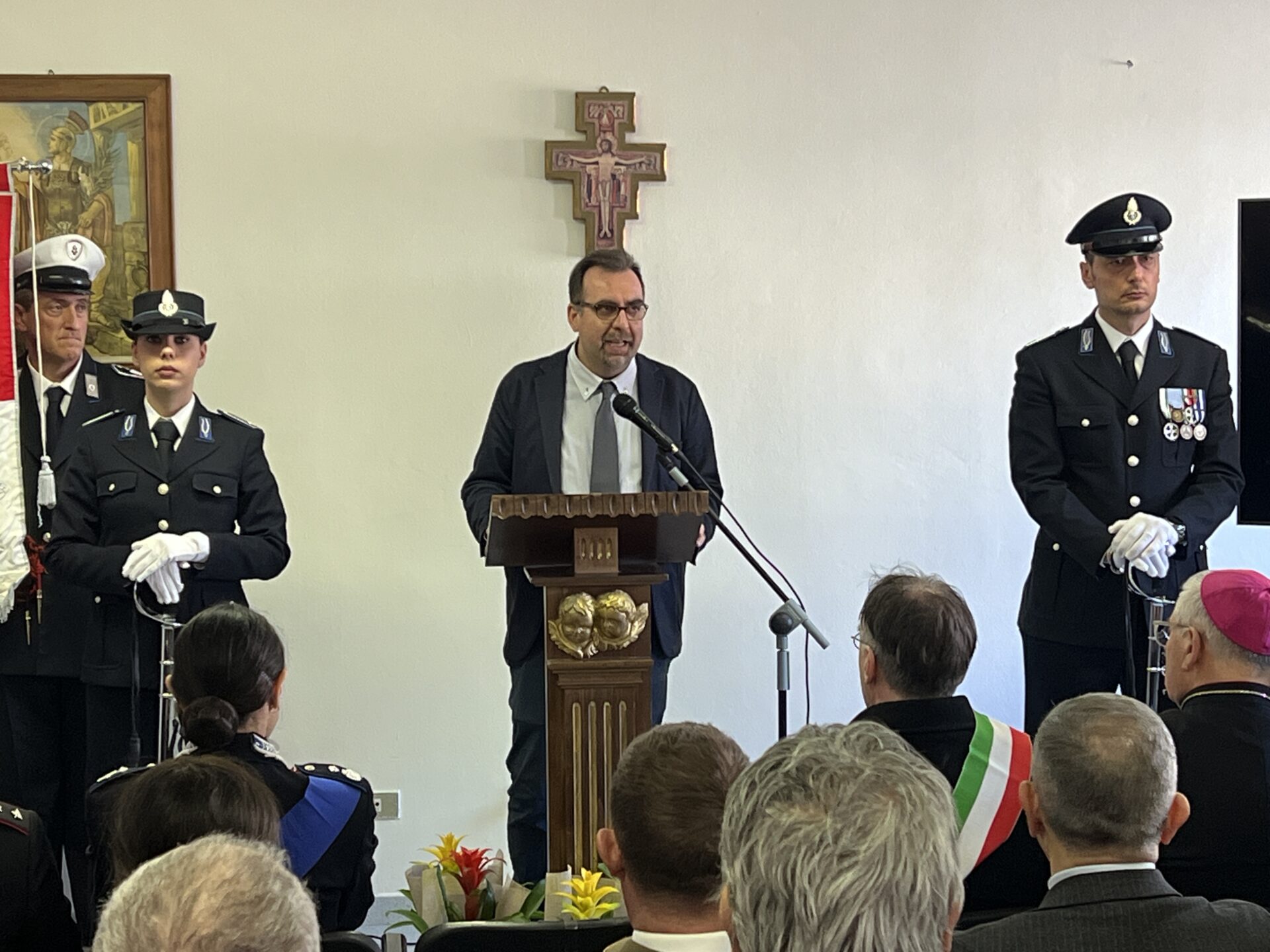 Un concetto sul quale è intervenuto, per primo, il capo dipartimento dell’amministrazione penitenziaria, Stefano Carmine De Michele, nel messaggio al personale letto all’inizio della celebrazione. “Lo Stato, dentro gli istituti penitenziari, – è scritto nel testo – ha il vostro volto, con la vostra professionalità e il vostro senso del dovere. E’ attraverso il vostro servizio quotidiano che lo Stato continua, infatti, a essere presente, autorevole e credibile nei luoghi più difficili e delicati della Repubblica”.