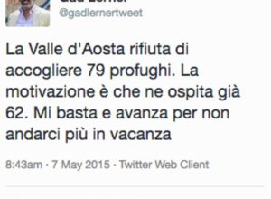 Questo il tweet di questa mattina del giornalista e presentatore televisivo: La Valle d'Aosta rifiuta di accogliere 79 profughi. La motivazione è che ne ospita già 62. Mi basta e avanza per non andarci più in vacanza