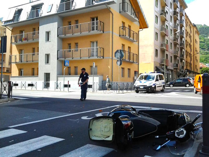 Incidente stradale, nel pomeriggio di oggi, lunedì 6 giugno, ad Aosta. Una Panda bianca, condotta da una giovane donna, e uno scooter "Vespa Gts3000" nero, con a bordo un 59enne, si sono scontrati all’incrocio tra via Lys e via Chambéry.