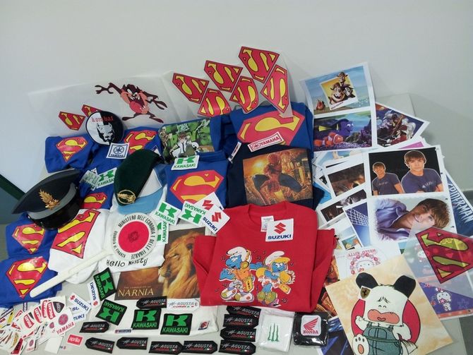 Centinaia di toppe, stemmi e adesivi griffati con i loghi delle marche automobilistiche e motociclistiche più famose, dalla Yamaha alla Ducati, ma anche magliette e cappellini raffiguranti i personaggi più noti dei cartoni animati, dei videogiochi e dei fumetti dei ragazzi, come i Puffi o Superman. Tutti rigorosamente taroccati.
