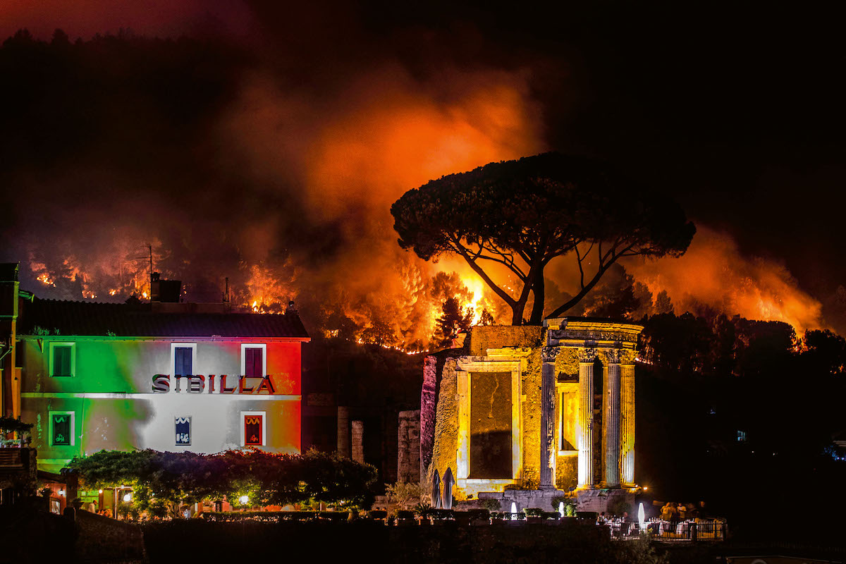 Massimo Percossi, 13 agosto, Roma, Italia – Le fiamme lambiscono il tempio romano di Vesta nel centro storico di Tivoli