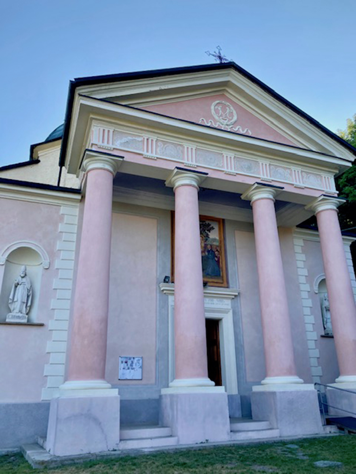 La struttura attuale, ultimata nel 1853, presenta una pianta a croce greca con una grande cupola al centro e un inaspettato pronao in stile neoclassico a quattro colonne, di colore rosa, con l’affresco raffigurante la Vergine col Bambino tra i santi Brigida e Pietro Fourier sulla facciata.