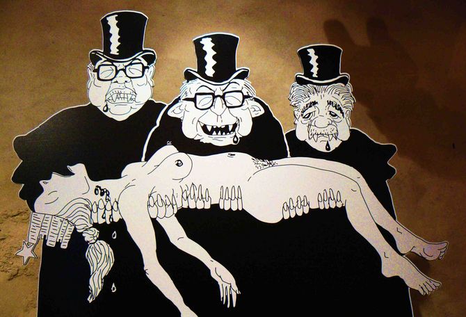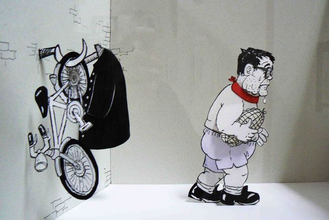 Non si tratta semplicemente di una serie di disegni appesi alle pareti, apprezzabile ma scontata. Le vignette satiriche sono presentate attraverso stampe, gigantografie, sagome ritagliate, sculture e modelli in legno, metallo, carta, gesso, resina, tela, cartone, e varie installazioni multimediali. Inoltre sono stati messi a disposizione del pubblico degli I-Pod, contenenti video, interviste e interventi. L’allestimento scenografico, di forte impatto, è stato concepito in modo da colpire l’immaginazione dello spettatore, coinvolgendolo in un viaggio che attraversa sette legislature, e vari decenni di politica e costume italiani.