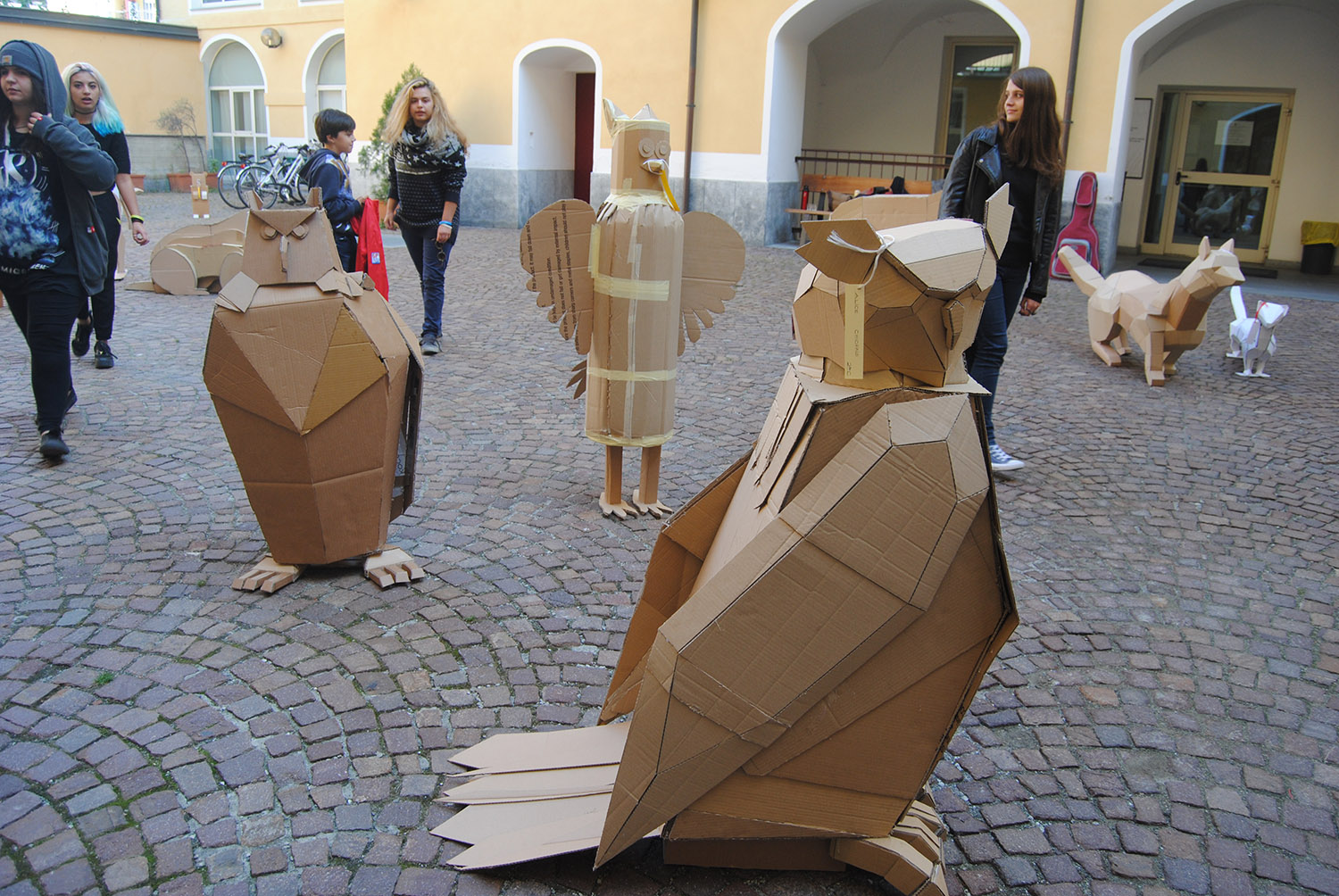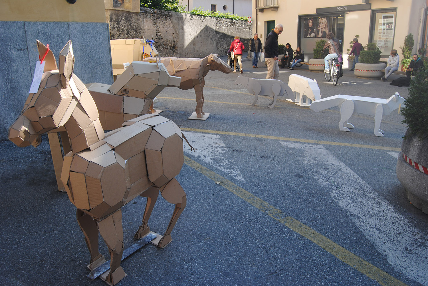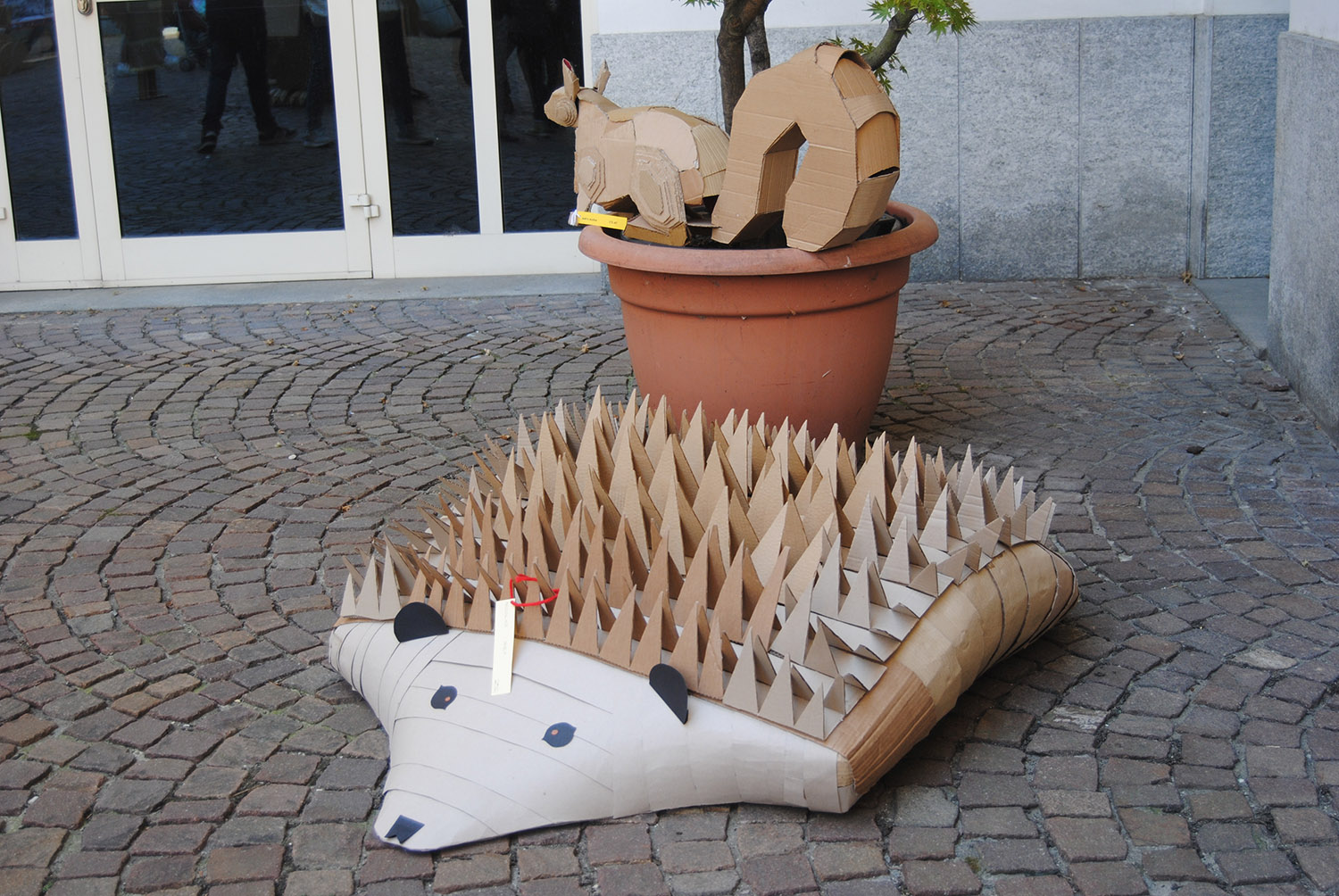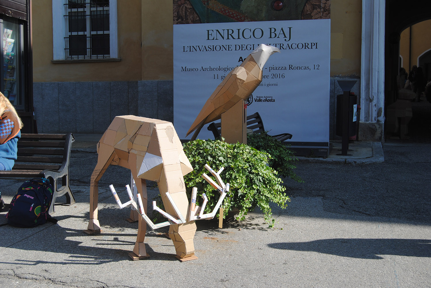 Esposizione di elaborati in cartone riciclato degli studenti delle classi seconde del Liceo Artistico di Aosta in piazza Roncas.