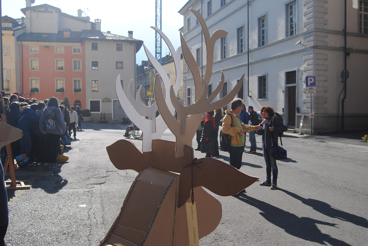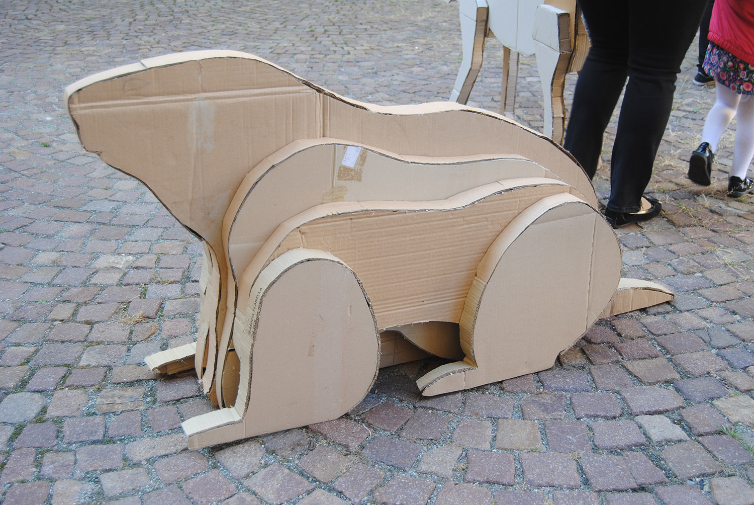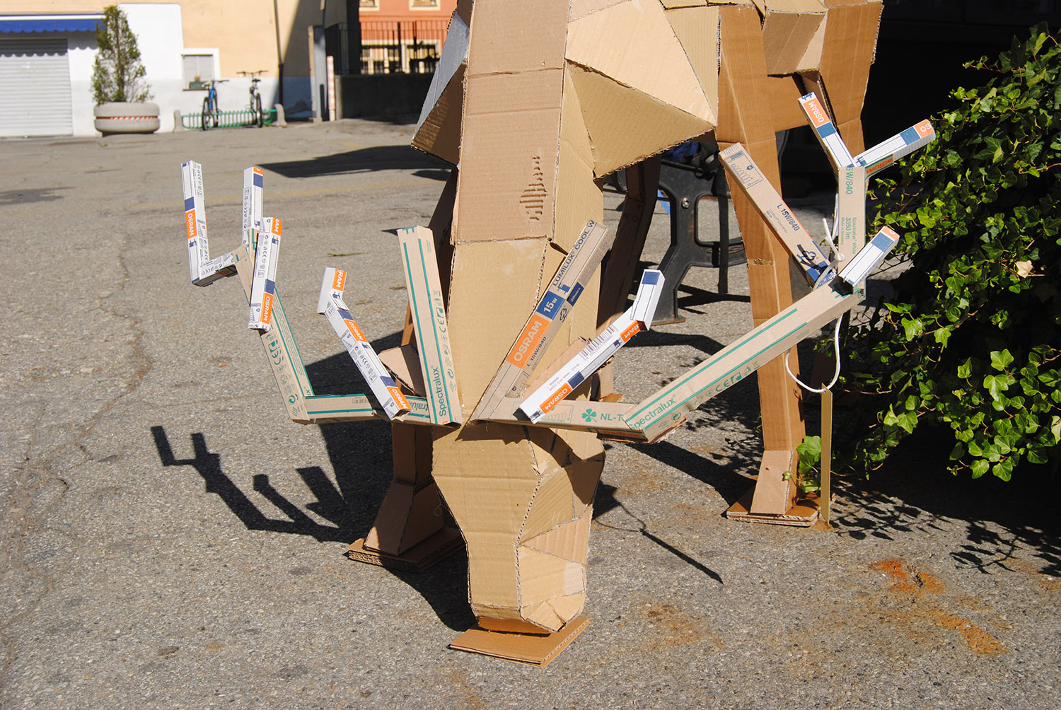 Esposizione di elaborati in cartone riciclato degli studenti delle classi seconde del Liceo Artistico di Aosta in piazza Roncas.