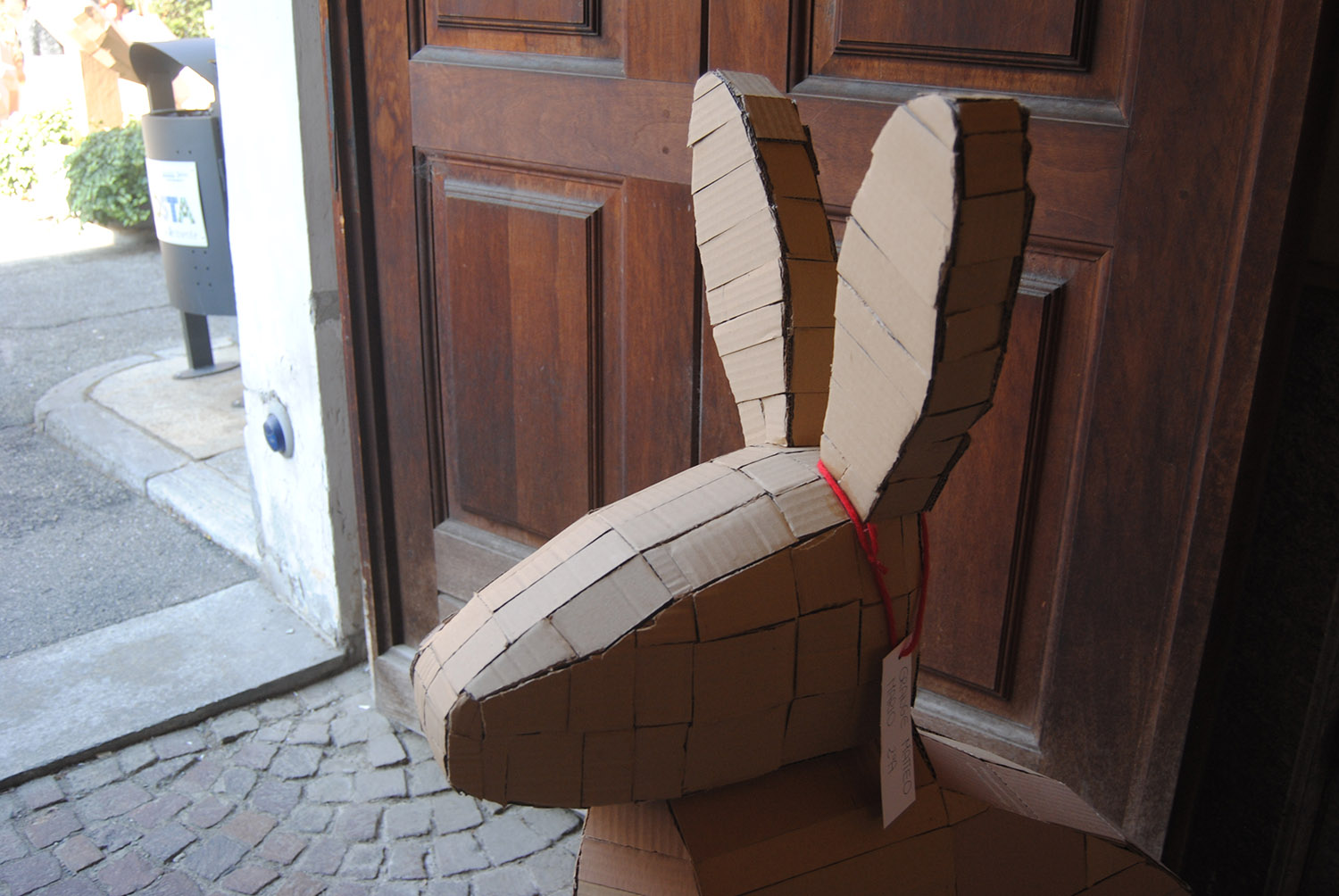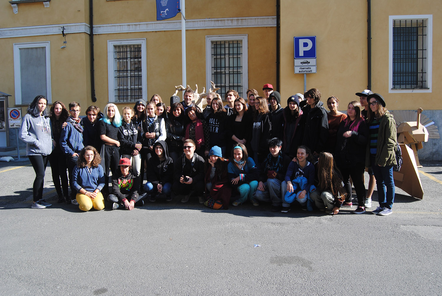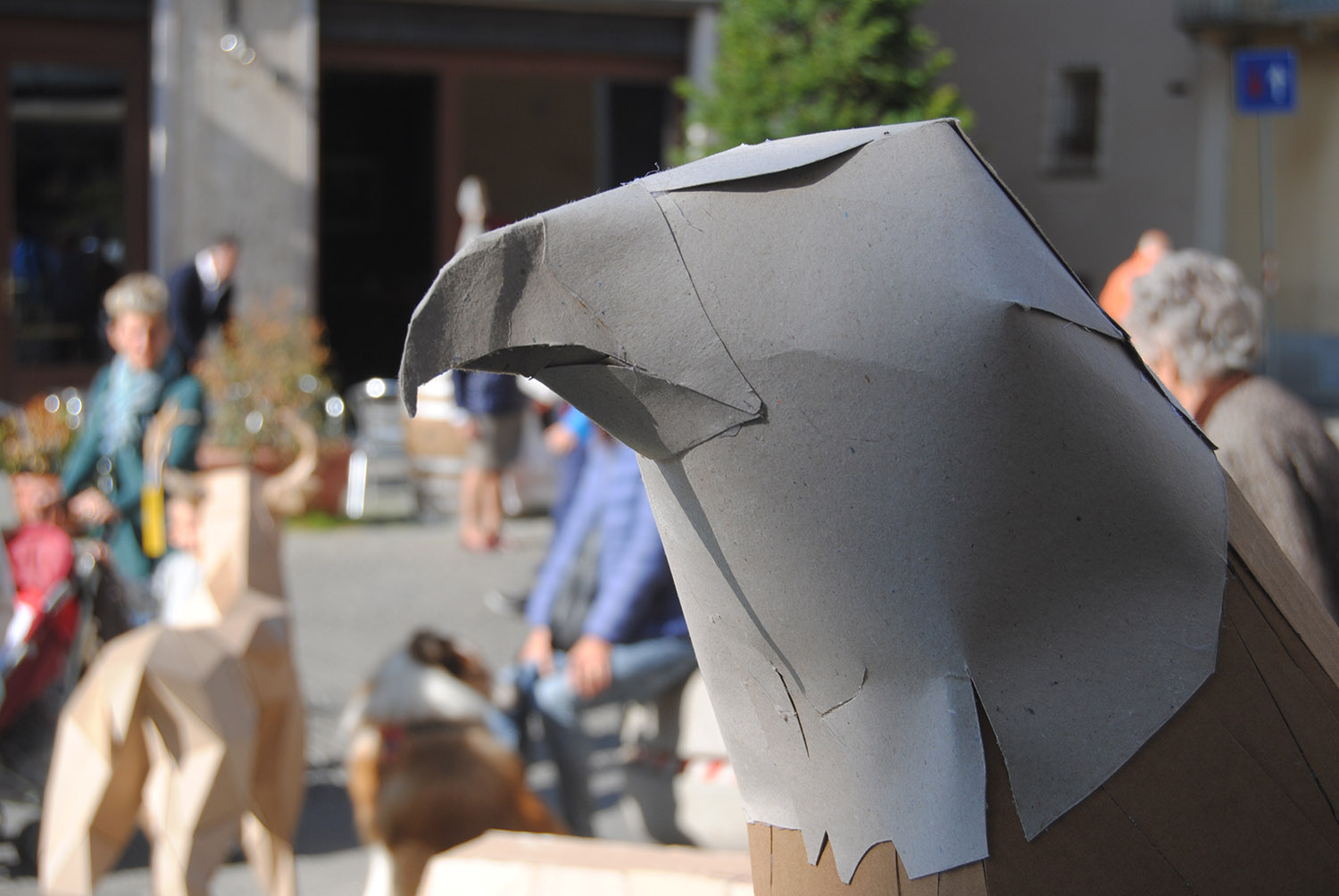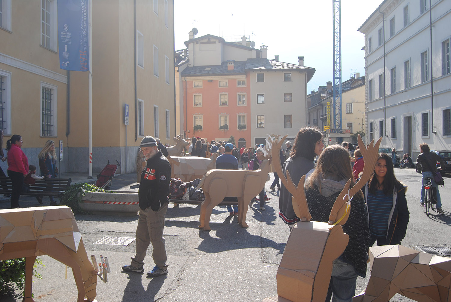 Esposizione di elaborati in cartone riciclato degli studenti delle classi seconde del Liceo Artistico di Aosta in piazza Roncas.