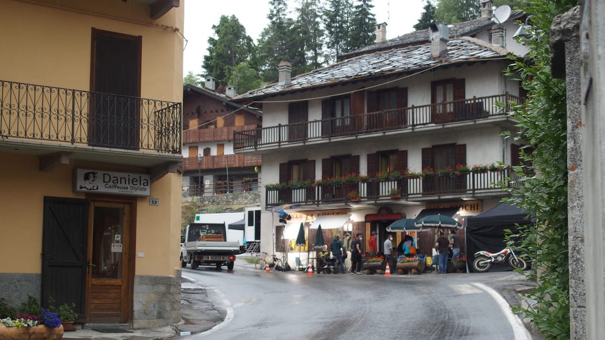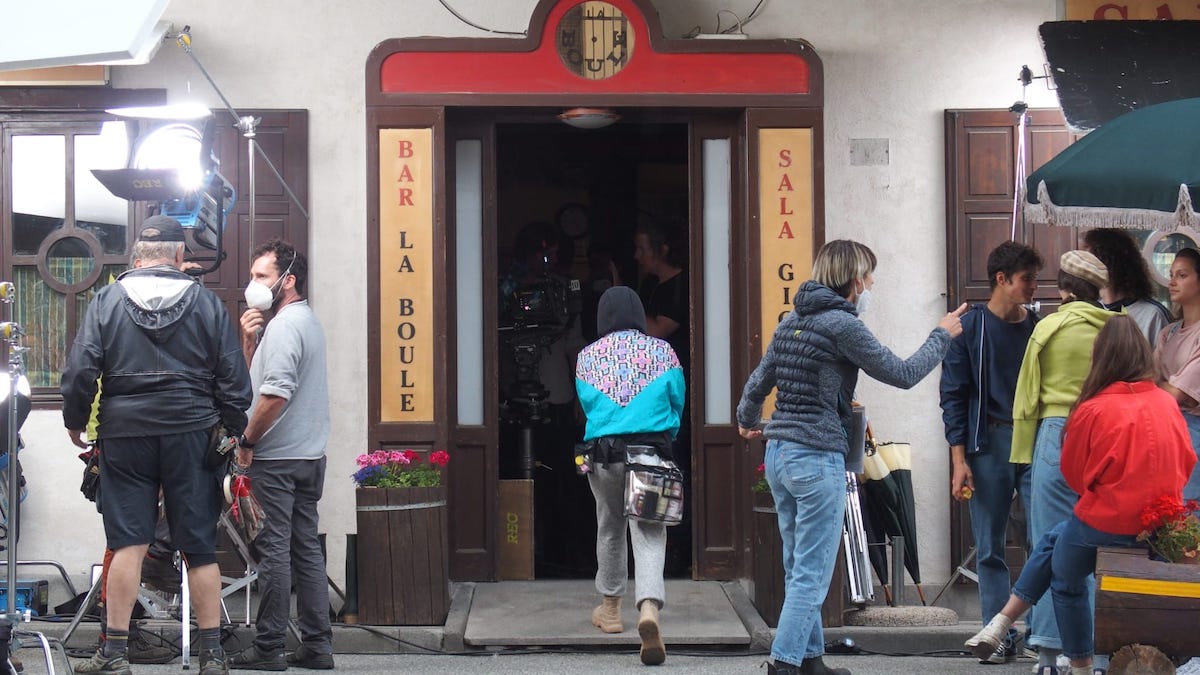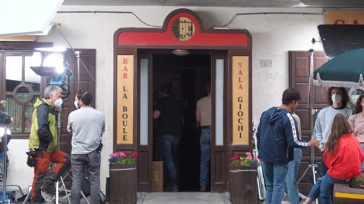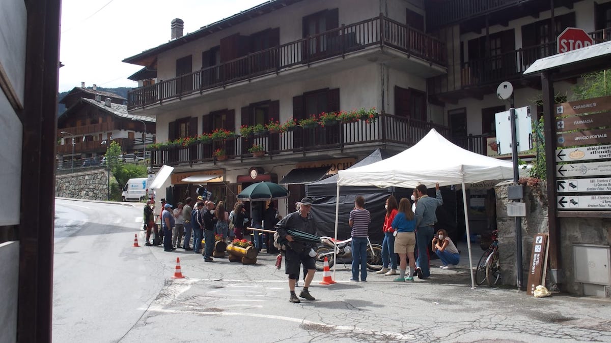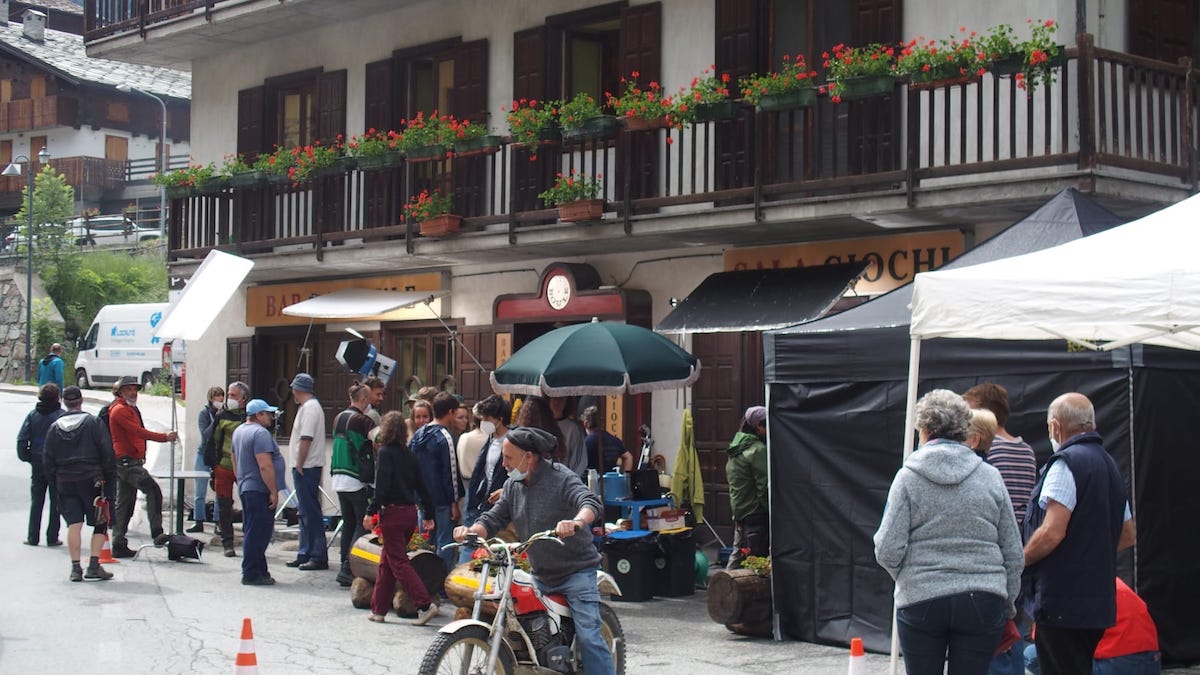 Un’atmosfera anni ’80 aleggia nel centro di Brusson. Le innumerevoli comparse affollano il dehors del Bar “la Boule” dalle 12. Alcuni sono in tenuta da manovale. Tra di loro si scorge quello che parrebbe l’interprete di Bruno, uno dei due protagonisti, in età adolescenziale.