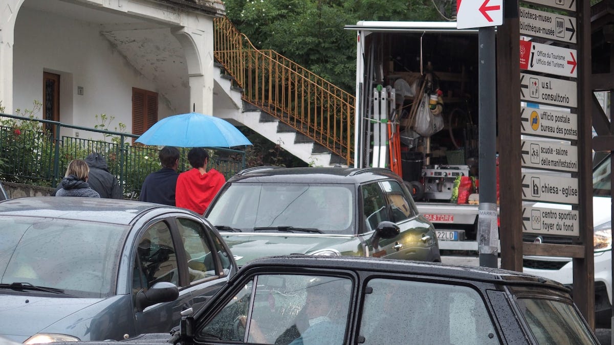 Un’Aprilia da trial bianca e rossa è parcheggiata di fronte a un gazebo. È in prossimità del Bar “La Boule”, nel centro di Brusson. Il telaio è zuppo.