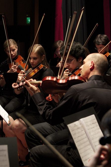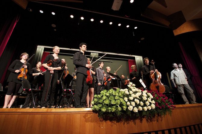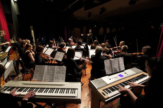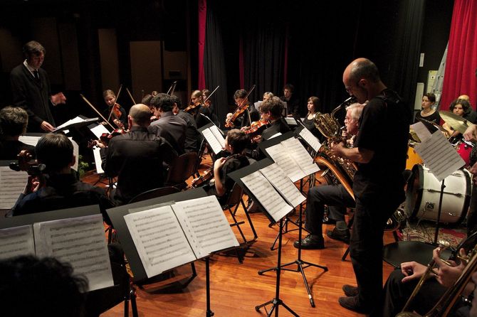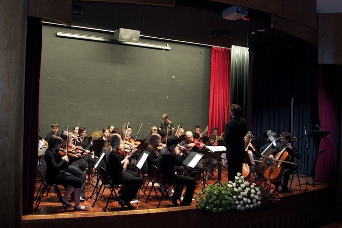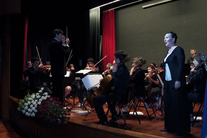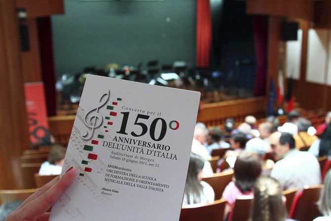 A Morgex, organizzato dal Celva, il concerto dell’ Orchestra Sfom per i 150 anni dell’Unità d’Italia. Protagonisti 40 giovani musicisti dei corsi non pareggiati tra brani tratti da famose pellicole e con le letture di Andrea Damarco. Ph.Vignolni
