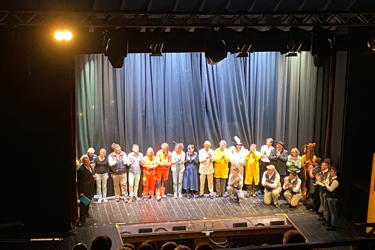 A tenere in piedi la prima pièce che, a differenza delle altre due risulta più debole e trascinata, è sicuramente uno degli ingressi più interessanti del 2023 nelle file di Lo Charaban: Joel Albaney che, direttamente dalla compagnia di Le Digourdì, porta in scena la sicurezza di un patois attualizzato e moderno, grazie anche al personaggio di Dous-Amèr, un creatore di moda incompreso al bar di paese, ma pieno di idee rivoluzionarie per la moda. Figlio d’arte (il padre Flavio ha fatto parte della compagnia per anni n.d.r.), Joel Albaney arriva al Giacosa con una vera e propria claque che non manca occasione di dimostrare all’attore il supporto e il sostegno. Nonostante sia il suo esordio, le parti che gli sono state assegnate sono relativamente lunghe e sicuramente dinamiche, oltre che fondamentali nella costruzione della pièce: l’animatore balneare che fa ballare la coppia Martinetto-Jacquin in vacanza a Miami è la ciliegina sulla torta di uno scambio veloce, ma carico di comicità.