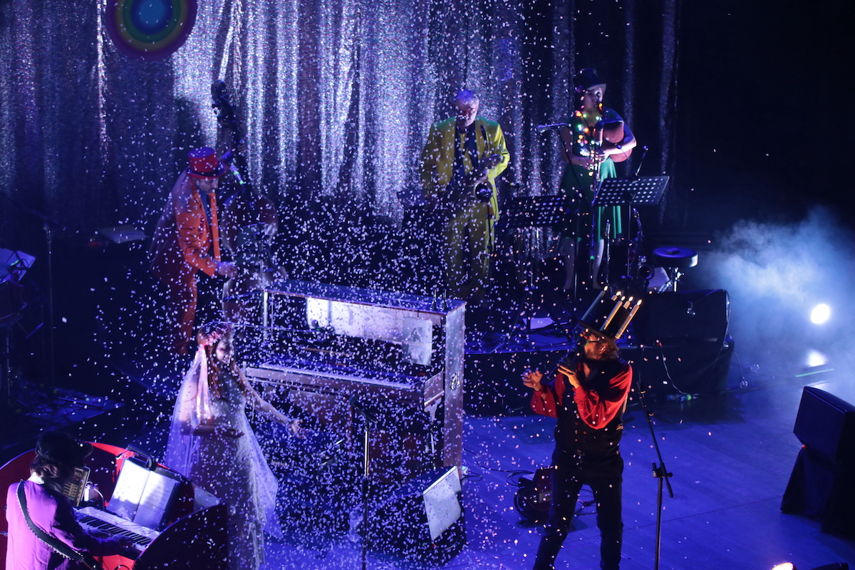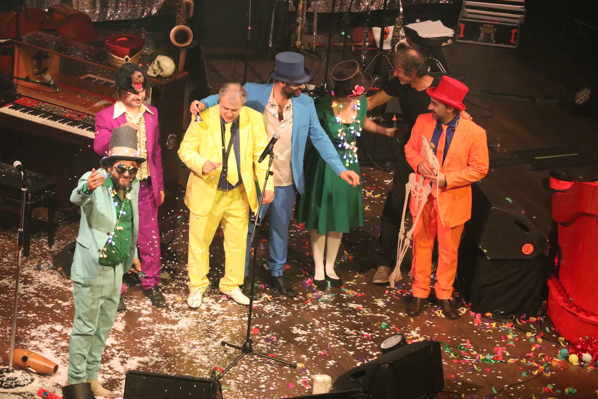 Nella bolgia di rumori, suoni, coriandoli Vinicio e soci – Alessandro Stefana, Sophia Tomelleri, Piero Perelli, Irene Sciacovelli, Nadia Addis, Andrea Lamacchia e Michele Vignali – c’è lo spazio per una festa multiforme. Che sa farsi grande classico rivisitato come in Campanelle – che poi sarebbe una strapazzata di Jingle bells – o trascina nella terra natìa di Vinicio, quella Germania vissuta solo sei mesi alla quale si richiama proprio il pezzo Sciusten feste n.1965.