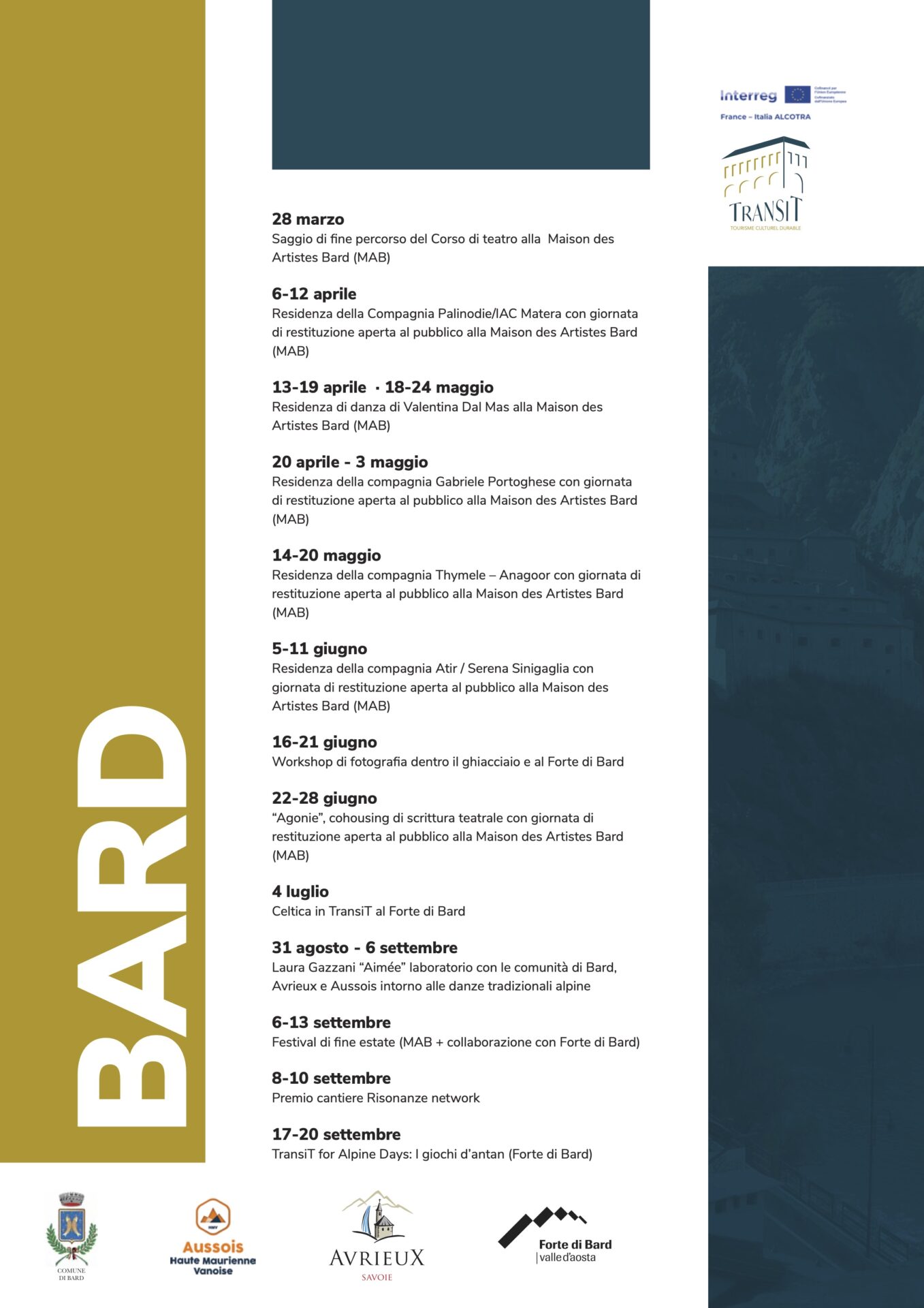 La programmazione completa, che si arricchirà prossimamente, è disponibile sul sito https://www.comune.bard.ao.it/it-it/novita/avvisi/2025/la-nuova-programmazione-artistica-multidisciplinare-e-transfrontaliera-2026-di-transit-374783-1-1e19957855ec7c814e783c70b69bde6a