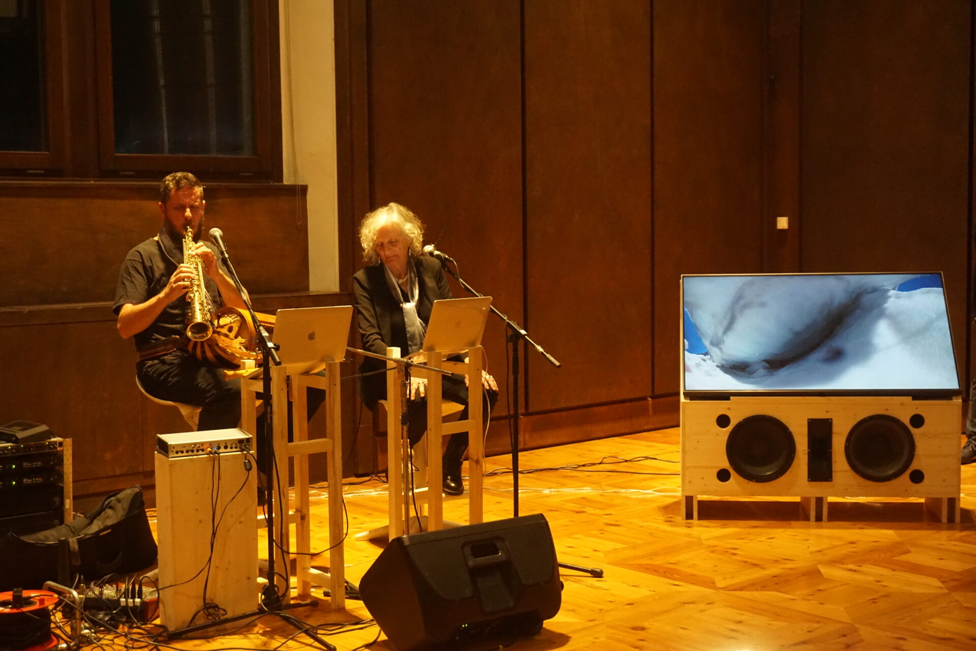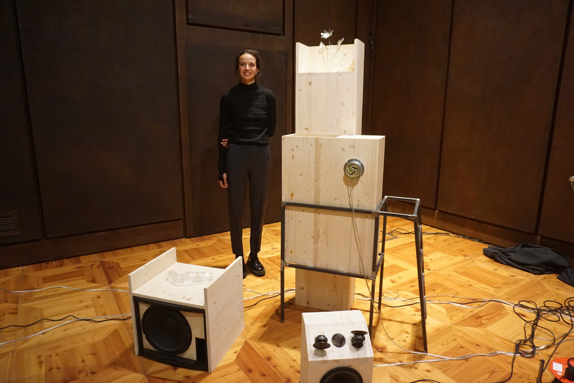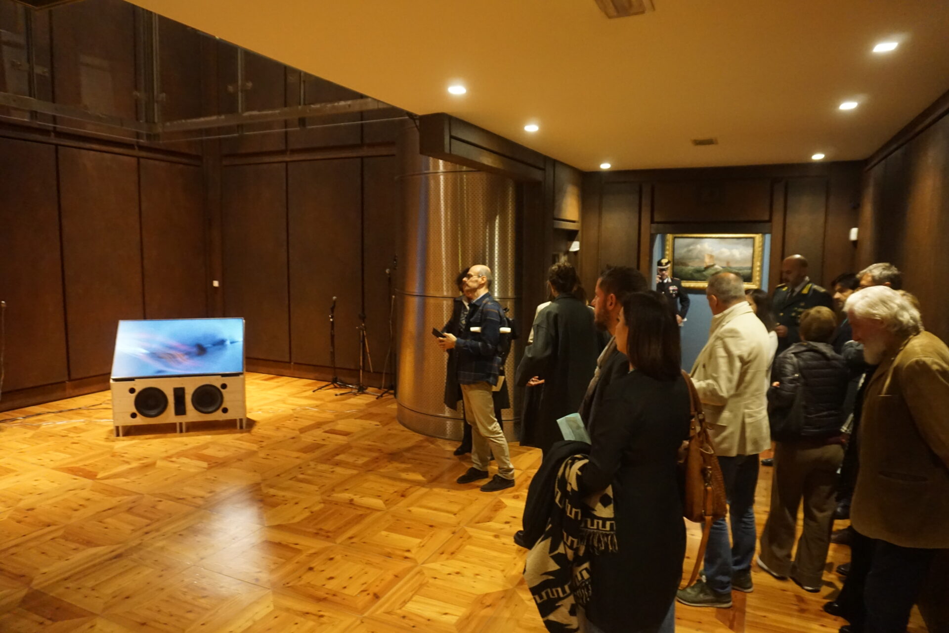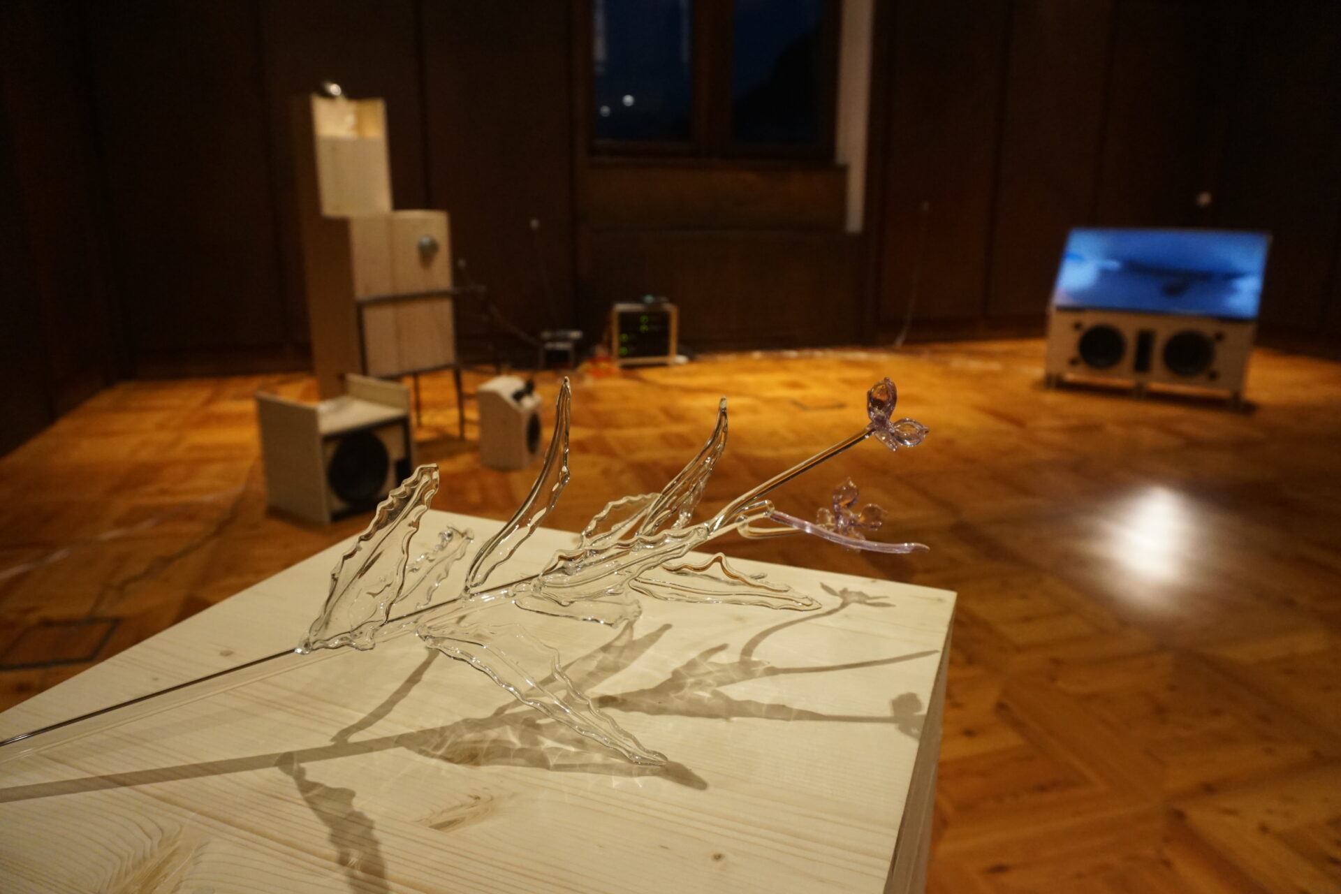 La pinacoteca, che espone anche una delle sole due tele presenti sul suolo italiano di William Turner, da ormai dieci anni ha come obiettivo far comunicare tra loro diversi linguaggi artistici e immaginare un nuovo tipo di cultura in movimento, sempre pronta a contaminazioni e suggestioni; in questo contesto dinamico e moderno si inserisce il lavoro di Caterina Gobbi, giovane artista di Courmayeur, performer e dj, laureatasi al Royal College of Art di Londra con un Master in Fine Art nel 2018. La giovane valdostana indirizza la propria ricerca al rapporto che gli esseri umani instaurano con l’ambiente circostante. Elemento fondamentale a sostegno della sua ricerca è, appunto, quello del suono, utilizzato come mezzo esplorativo delle diverse relazioni con cui l’artista crea installazioni sonore che coinvolgono atti partecipativi di ascolto e che sono composte da oggetti ibridi nei quali altoparlanti o traduttori sono incorporati in elementi scultorei e spaziali.