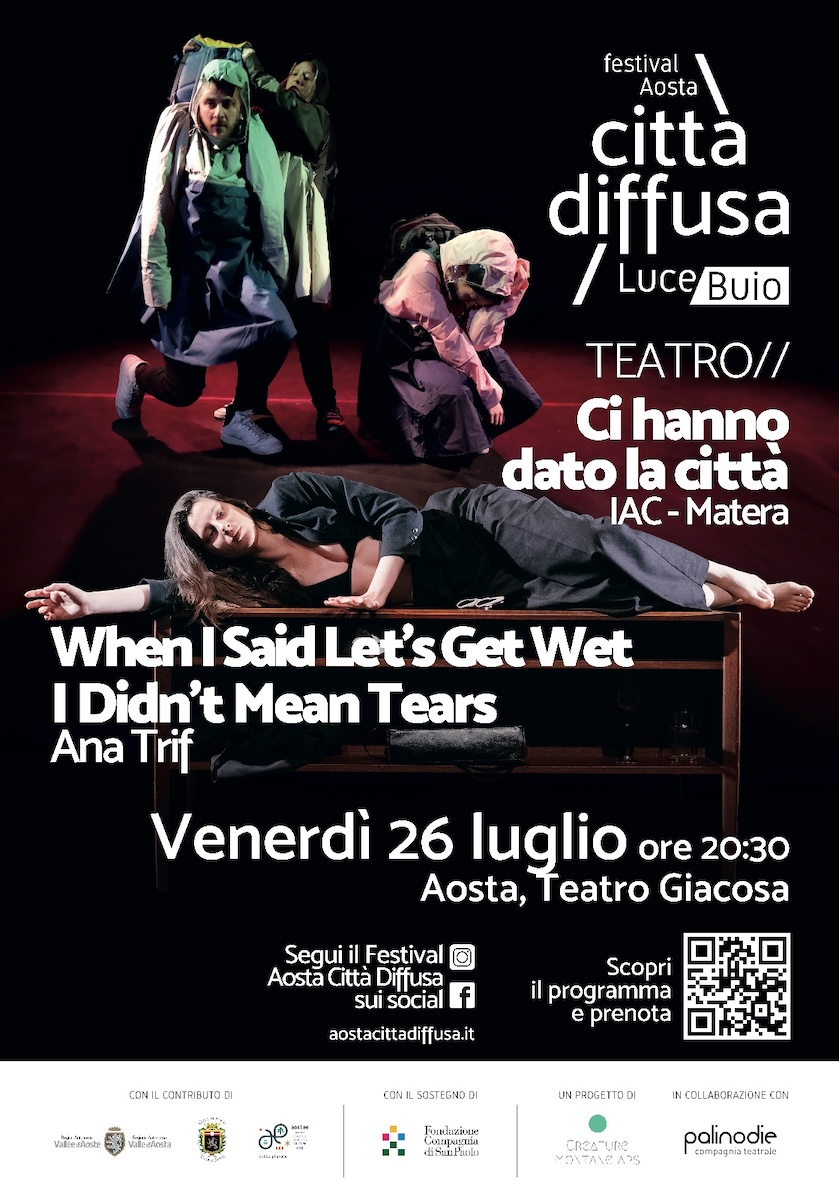 La direzione artistica di Aosta Città Diffusa è di Verdiana Vono e Stefania Tagliaferri. Il festival è realizzato grazie al contributo della Regione Autonoma Valle d’Aosta e del comune di Aosta con il sostegno di Fondazione Compagnia San Paolo.