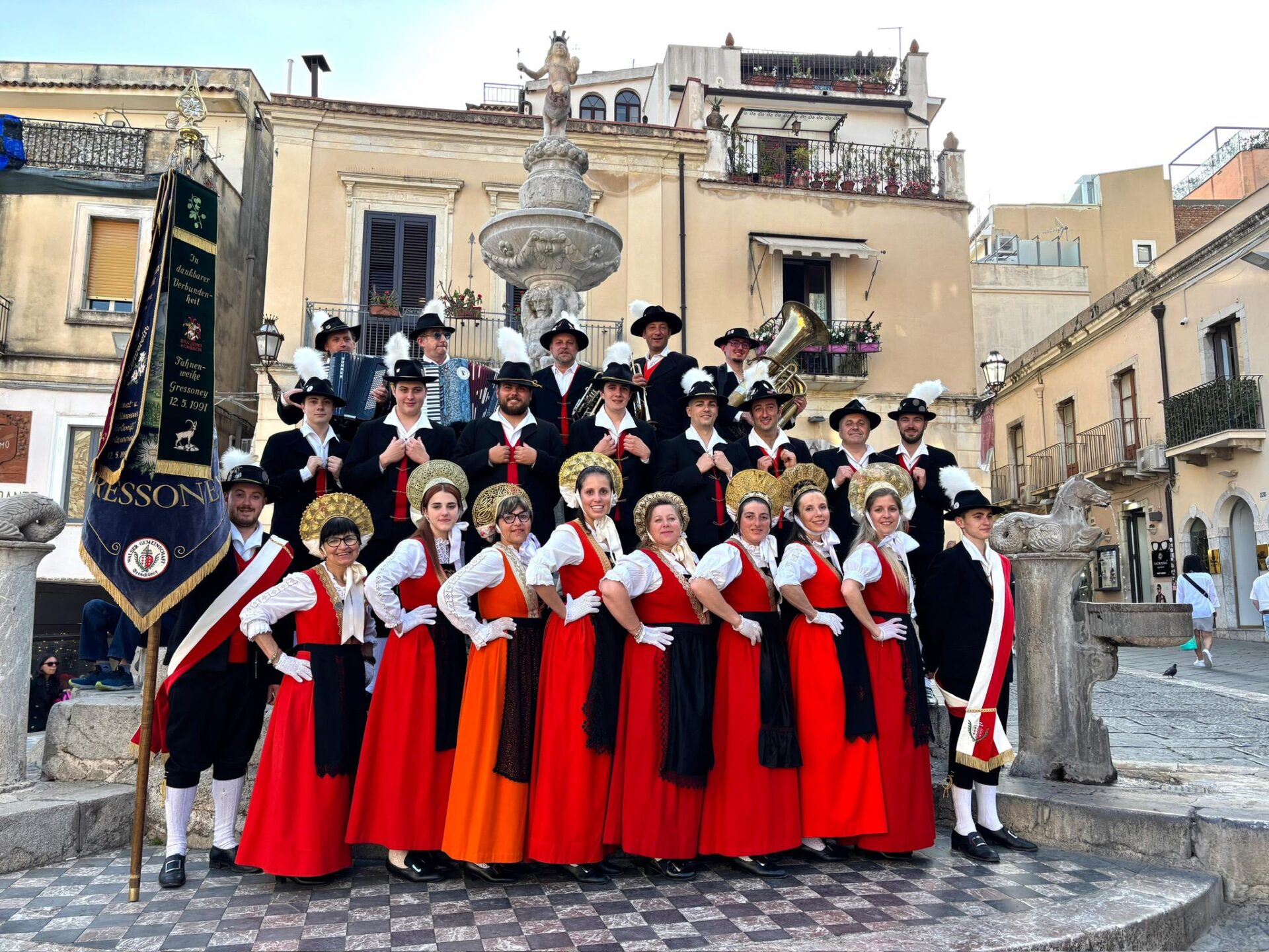 Dalla montagna al mare per far conoscere il tradizionale costume rosso di Gressoney, dallo scorso anno tutelato da un marchio e da un disciplinare. Il Greschoney Trachtengruppe – il gruppo folcloristico di Gressoney – è in questi giorni in Sicilia, per esibirsi nei suoi balletti walser alla seconda edizione del Sicily International Folk Festival, insieme ad altri gruppi folk provenienti dal resto d’Italia, dall’Austria, dall’Estonia, dalla Lituania e da Malta.