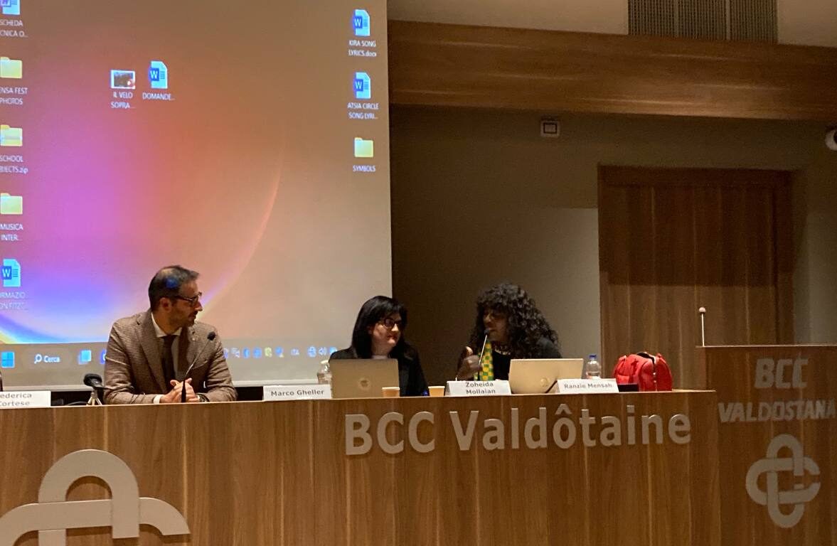 Ad aprire il discorso e presentare la serata al pubblico sono stati Federica Cortese, presidente della fondazione Lions Club Aosta Mont Blanc, e Corrado Binel, presidente dell’Istituto storico della Resistenza e l’intervento del presidente del Comitato scientifico della Fondation Chanoux, Alessandro Celi, il quale ha portato un breve riassunto del contesto storico in cui ci troviamo: “Tenendo a mente quattro elementi (geografico, demografico, economico e storico), possiamo delineare l’Iran come un paese improntato verso l’imperialismo, e che quindi ha bisogno di un’ideologia di fondo. Questa viene trovata nell’islamismo sciita, che quindi viene fatta diventare la bandiera di questo stato; e nonostante possa sembrare banale, un gesto come quello di rifiutare di mettersi il velo può essere estremamente significativo, in quanto va contro alla dottrina dello Stato“.