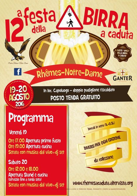 La Ganter sarà da venerdì 19 a sabato 20 agosto 2016 la grande protagonista della Festa della Birra a Caduta di Rhêmes-Notre-Dame, organizzata dalla Pro Loco. Giunto alla dodicesima edizione, l’evento ha trovato un consenso sempre più ampio da parte del pubblico non solo per la rinomata “bionda”, ma anche per il fitto calendario di appuntamenti che accompagnano la festa.