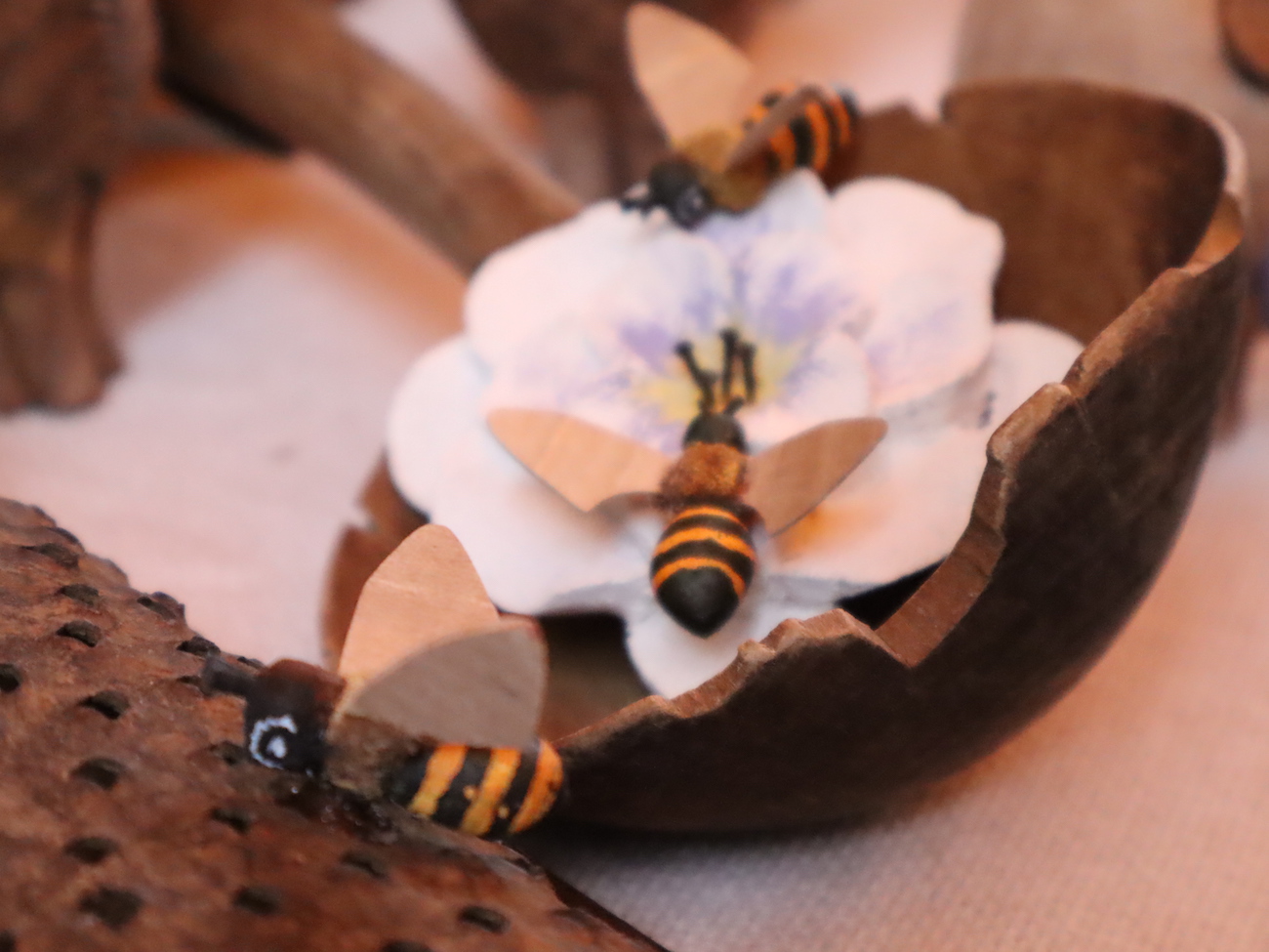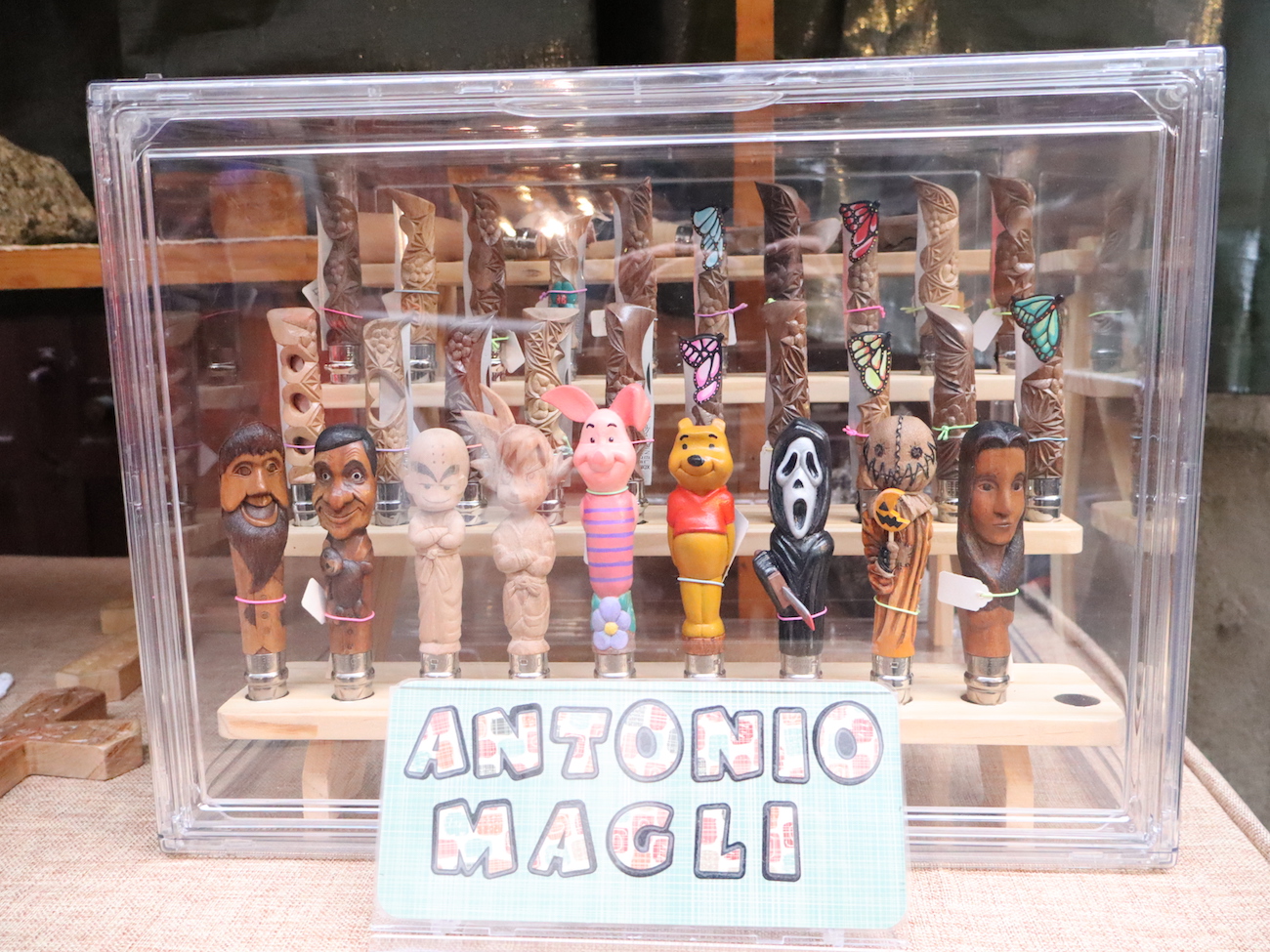Una metà del banco è occupata dai tulipani selvatici realizzati da Cyrille. “Sono dei tulipa sylvestris in tiglio, inseriti in una radice di larice con un basamento in acciaio per dare un tocco di modernità. In natura sono di un giallo brillante, ma ho preferito valorizzare il colore naturale del legno”. Sull’altra metà i coltelli di Antonio con manici in noce scolpiti, dove oltre alle classiche farfalle appaiono anche i personaggi più amati: da Mr Bean a Dragon Ball.
