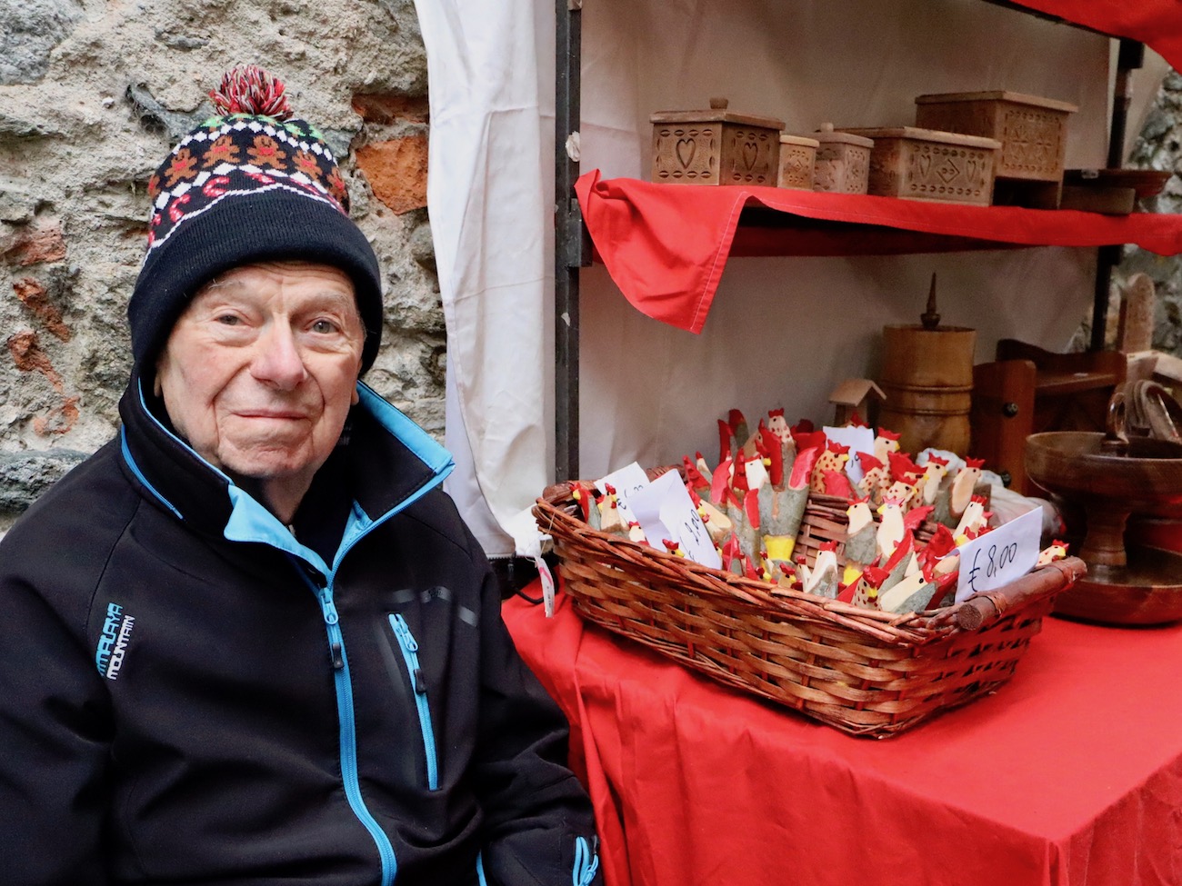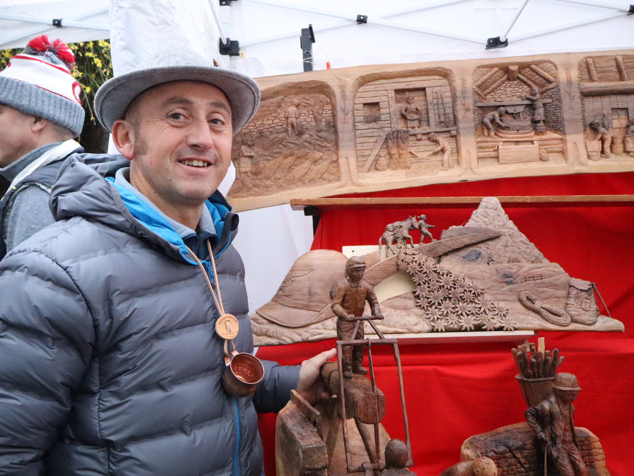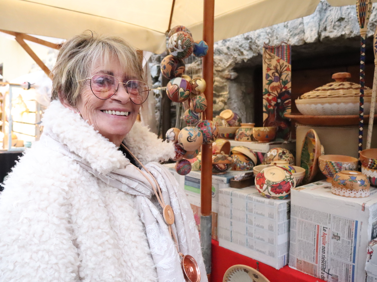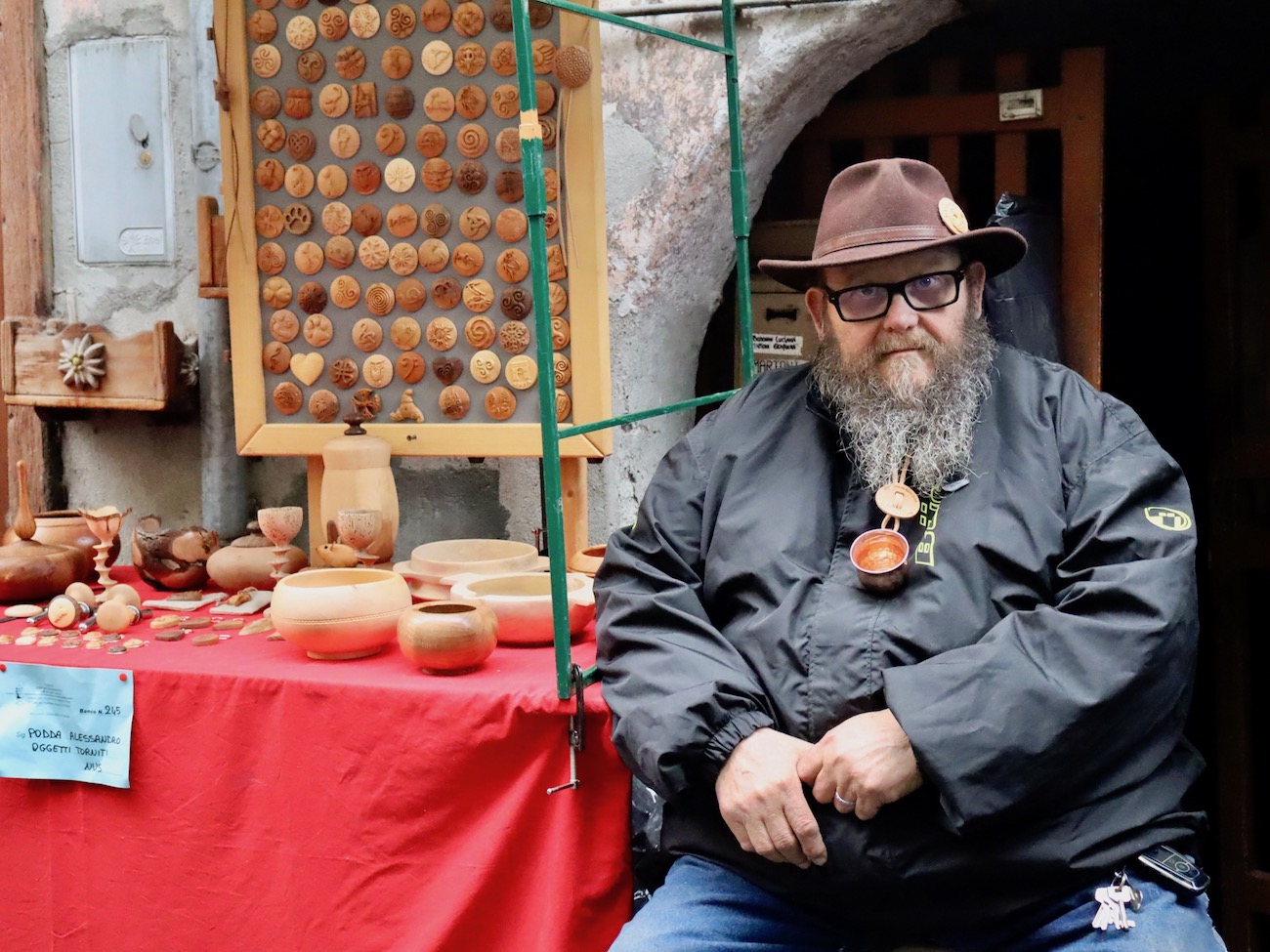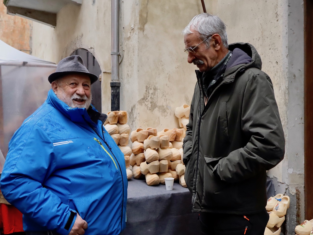 Tra i banchetti della Petite Foire si nascondono anche storie di amicizia. Da ormai cinque anni, a Donnas, Cyrille Chevalier e Antonio Magli condividono lo stesso banchetto. “Ci siamo conosciuti frequentando corsi di scultura. A Morgex, nei primi anni duemila” raccontano. “Partecipare insieme alla Fiera significa darsi una mano”.