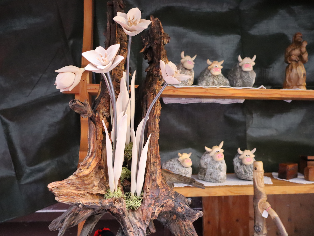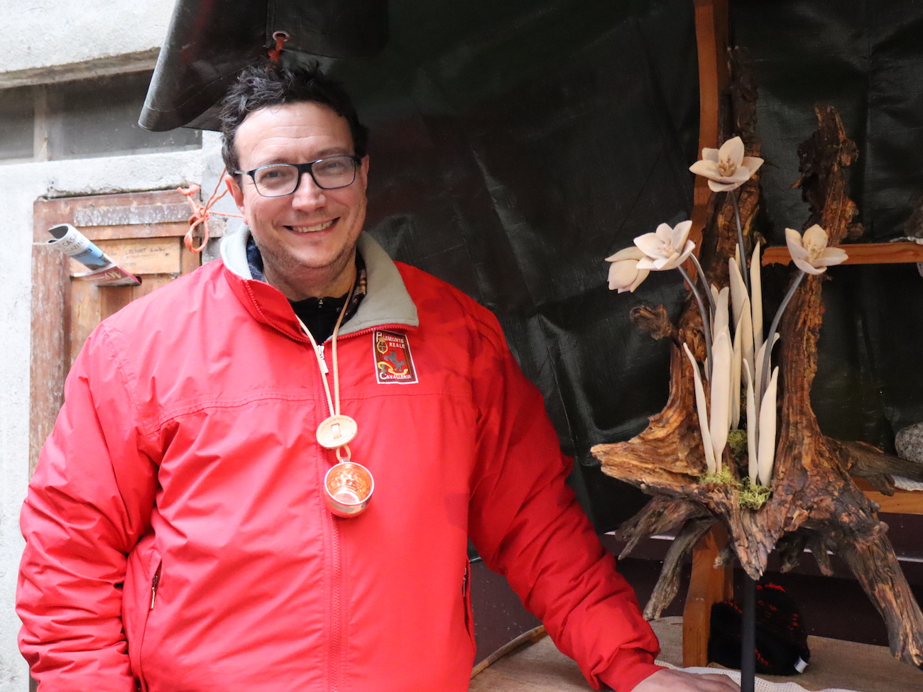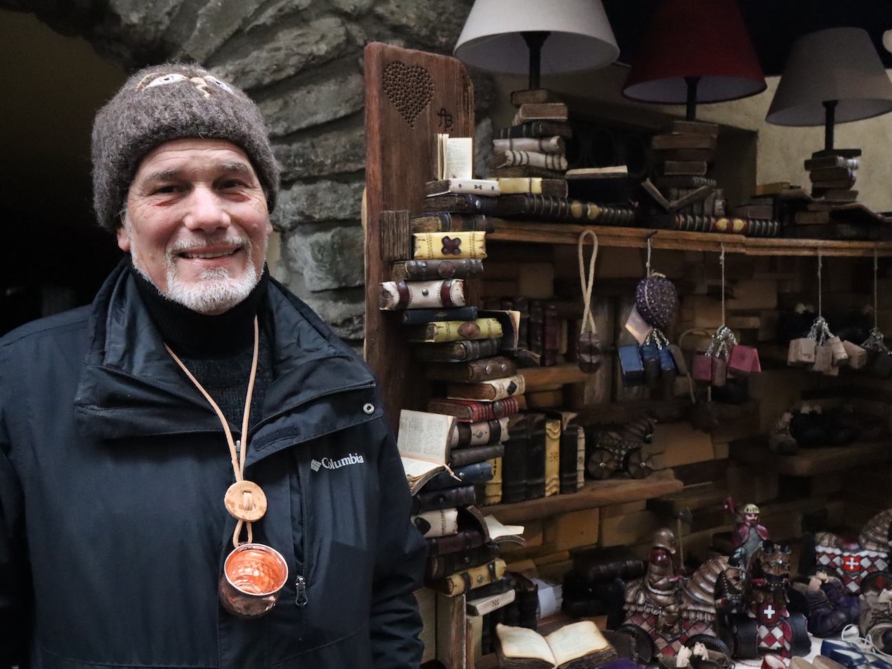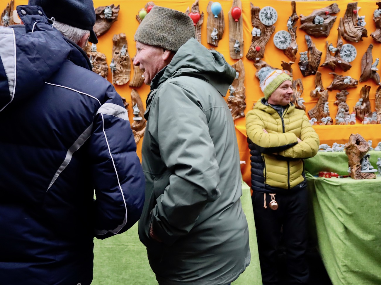 Tra i banchetti della Petite Foire si nascondono anche storie di amicizia. Da ormai cinque anni, a Donnas, Cyrille Chevalier e Antonio Magli condividono lo stesso banchetto. “Ci siamo conosciuti frequentando corsi di scultura. A Morgex, nei primi anni duemila” raccontano. “Partecipare insieme alla Fiera significa darsi una mano”.