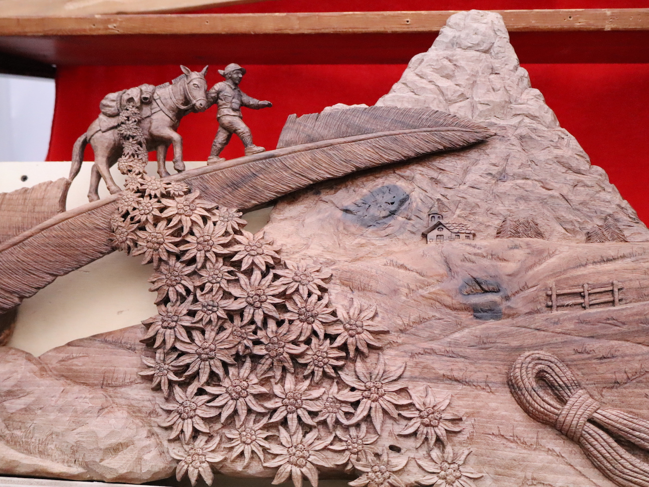Un alpino cammina con il suo mulo sulla piuma di un cappello e sparge stelle alpine in segno di speranza e solidarietà. È l’opera di Erick Bionaz, che ha scelto di scolpire, su noce, l’Operazione Stella Alpina, iniziativa di solidarietà, a cura dell’Associazione Nazionale Alpini, per raccogliere fondi.