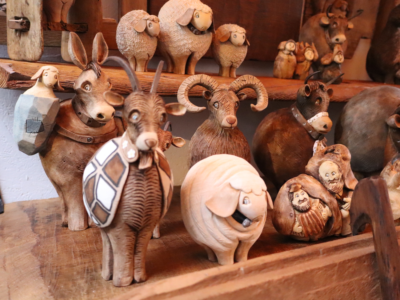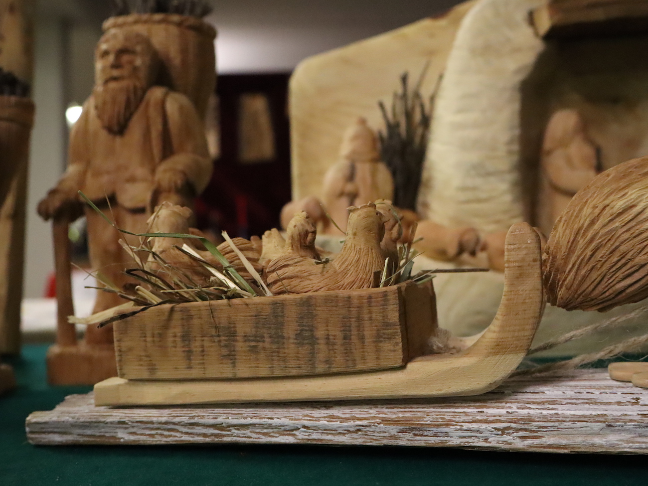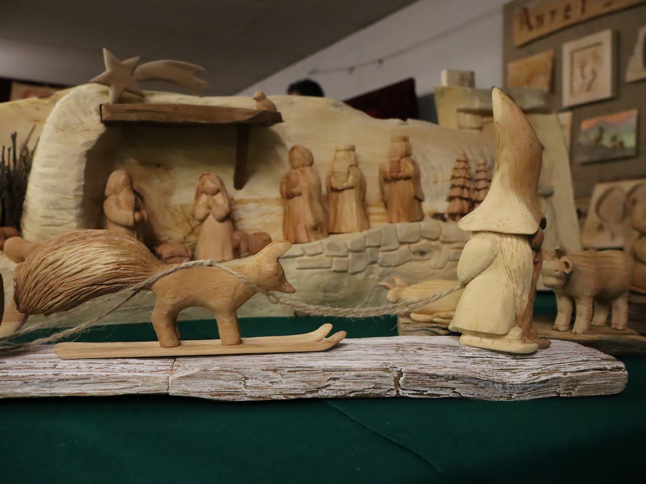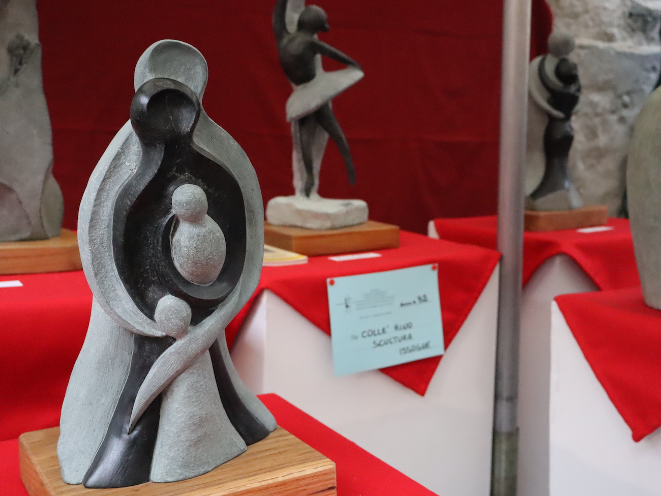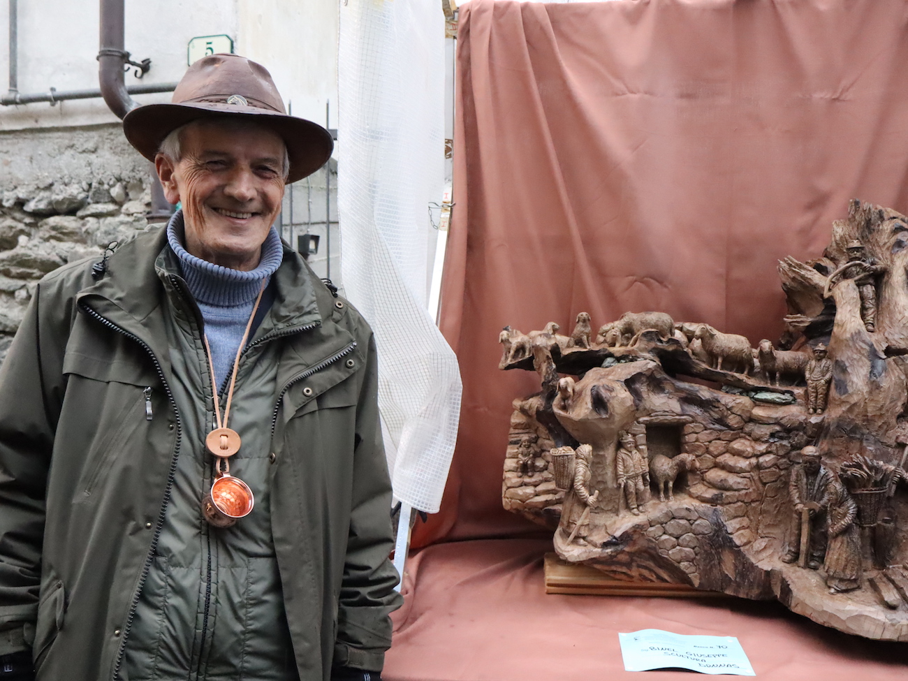 Qualche metro più in là, Giuseppe Binel presenta una scena pastorale con personaggi indaffarati in attività di vario tipo, dal taglio della legna al pascolo. “Preferisco non dare titoli alle mie opere, ognuno le interpreta come vuole” spiega la scultore di Donnas, che ha iniziato a esporre i suoi lavori nel 1981.