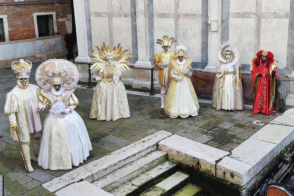 Noi siamo arrivati a Venezia il 5/2 e ripartiti il 14/2. I primi giorni c’era nebbia e poco sole, nel fine settimana invece è piovuto e le maschere, non solo noi, non sono uscite. Solo martedì grasso c’è stato pieno sole e noi abbiamo potuto fare vari shooting richiesti dai fotografi internazionali (che avremmo dovuto fare durante la settimana, se non fosse piovuto). I luoghi, scelti da loro, erano ovviamente lontani d alla calca di Piazza San Marco o San Zaccaria, ecc. Mi spiace che tu non ci hai visto. Se sei su FB puoi almeno vederci in foto (sempre se, ovviamente, vuoi essere in contatto con noi).