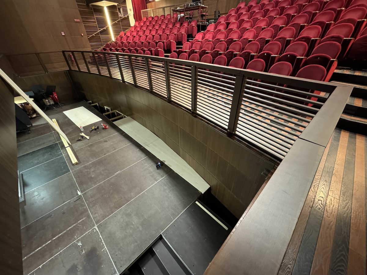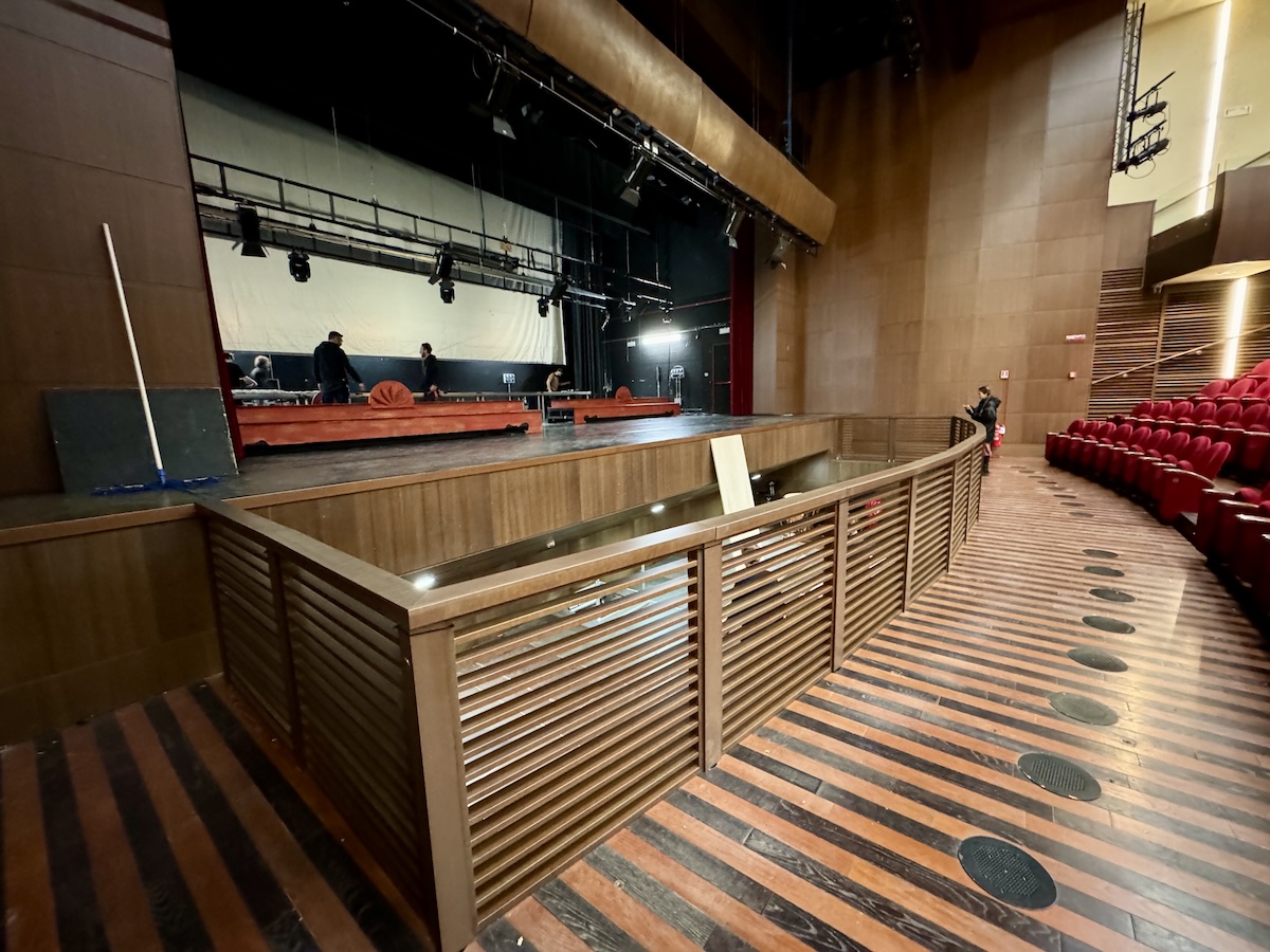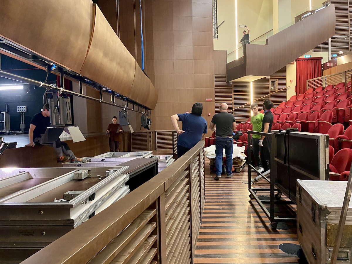 Per agevolare l’apertura della buca sono stati necessari alcuni adeguamenti degli spazi della platea: sono state smontate e tolte le prime tre file di poltroncine e montata una ringhiera di protezione. Lo spazio non è molto ampio, ma è profondo oltre due metri e mezzo. Questa caratteristica impedisce alle stelle sul palco di vedere il Direttore d’orchestra, un grosso problema in un’opera lirica. A completare i lavori di preparazione è stata quindi montata una pedana per alzare il livello della buca dell’orchestra.