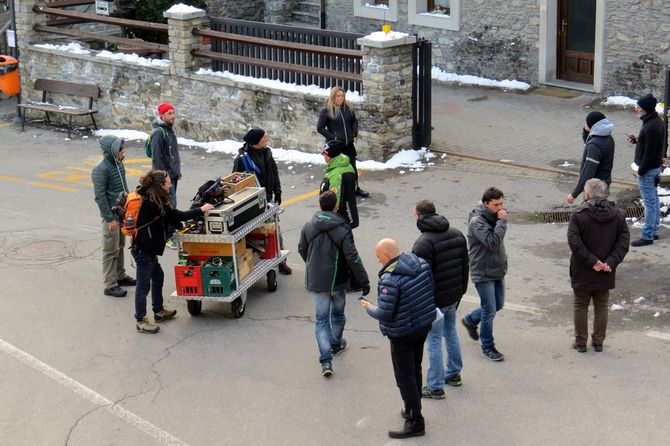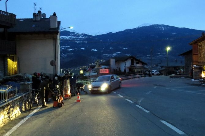 Qualcuno, nella zona di via Gilles de Chevrères, si è reso conto verso l'ora di pranzo che la giornata non sarebbe stata come le altre. E' infatti spuntata sul guard-rail lungo il Clou-Neuf della segnaletica che indicava il “campo base” e la “location”. Il primo, consistente in vari mezzi della produzione (guardaroba e trucco, in particolare), era allestito nella strada che conduce alla cappella di San Giocondo.
