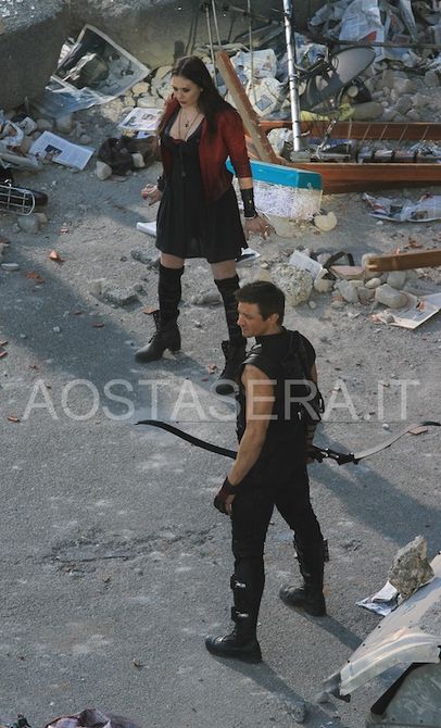 Ad ‘insaporire’ la giornata aostana è stato anche l’arrivo di Jeremy Renner, con arco e frecce d’ordinanza, nella parte di Occhio di Falco e delle due nuove reclute della squadra di supereroi: Scarlet Witch – interpretata da Elizabeth Olsen, con stivaloni e giacca rossa – e di suo fratello Quicksilver – Aaron Taylor-Johnson – anch’essi sul set cittadino, supervisionati dall’occhio attento del regista Joss Whedon.