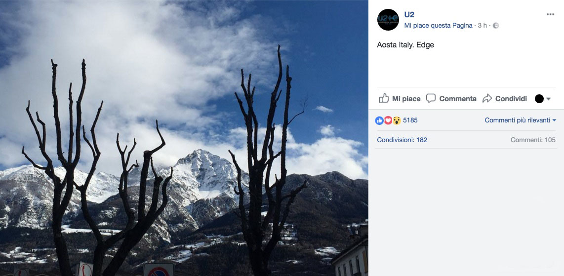 Gli U2 ad Aosta? Non una “fake news” né una data del tour nella periferia d'Italia, ma un fondo di verità – anzi più di uno – c'è. Apparsa – nella quasi indifferenza – su tutti social ufficiali della storica band irlandese, poco dopo le 16 – ma scattata alle 9 del mattino – è apparsa una foto inequivocabile, scattata dai pressi del parcheggio dell'Arco d'Augusto: la Becca di Nona, innevata davanti all'Emilius, in fondo l'insegna delle cabine telefoniche, tra le poche rimaste ad Aosta, e il tetto dell'edificio dove ora c'è la Bcc.