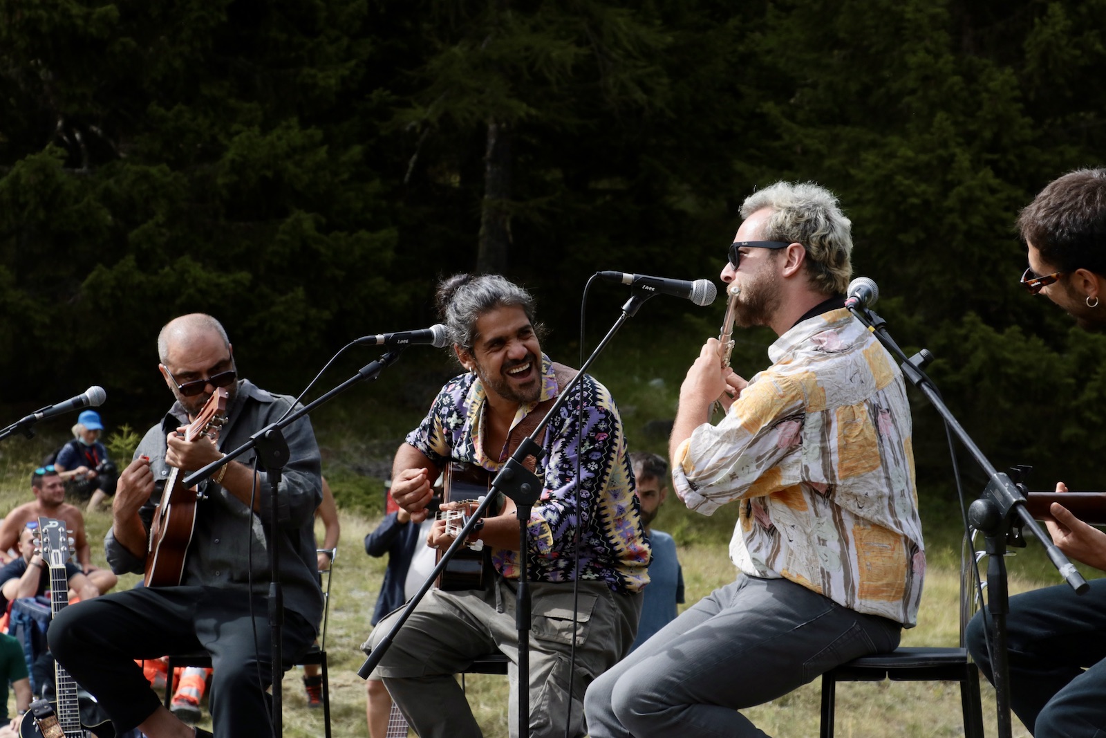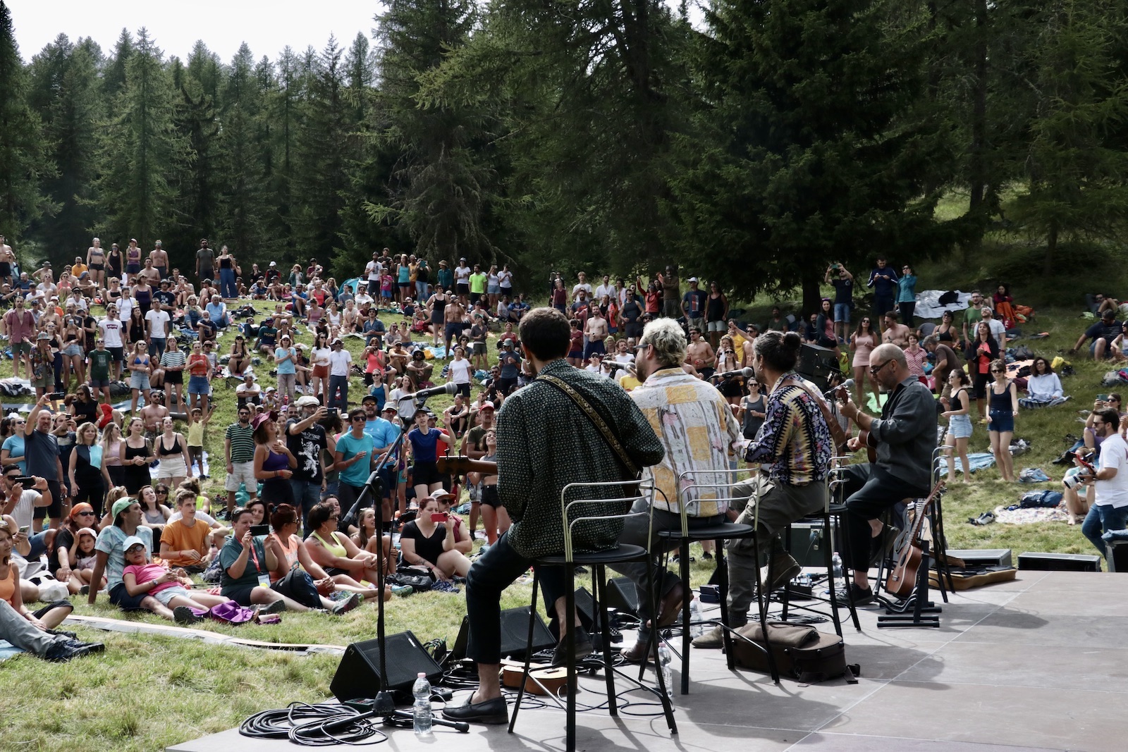 Con un’escalation ben ponderata il concerto si apre, passando da brani meno ritmati e quasi parlati come L’Impero e Fiume Nero, momenti in cui la voce bassa e ruvida del cantautore resta dolce e piena di emozioni, come un sussurro. Poi, con calma seguendo il ritmo della natura e quello delle prime ragazze che cominciano ad alzarsi in piedi ballando, Mannarino prende il microfono. L’emozione del cantautore di esibirsi letteralmente in mezzo alle montagne è evidente, e lui ci tiene a raccontarla, tanto che l’unica volta in tutto il concerto in cui si rivolge direttamente al pubblico parla proprio di questo. “Eh ragazzi, non ci posso fa niente, qua viene diverso… c’è più libertà, nella natura questa scaletta continua a cambiare. È bellissimo suonare qui, per noi è un privilegio, è un capolavoro” una frase che colpisce tutti e provoca il primo, vero applauso scrosciante in una liberazione di energie trattenute.