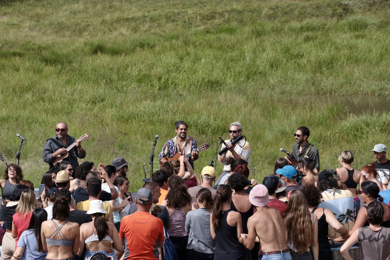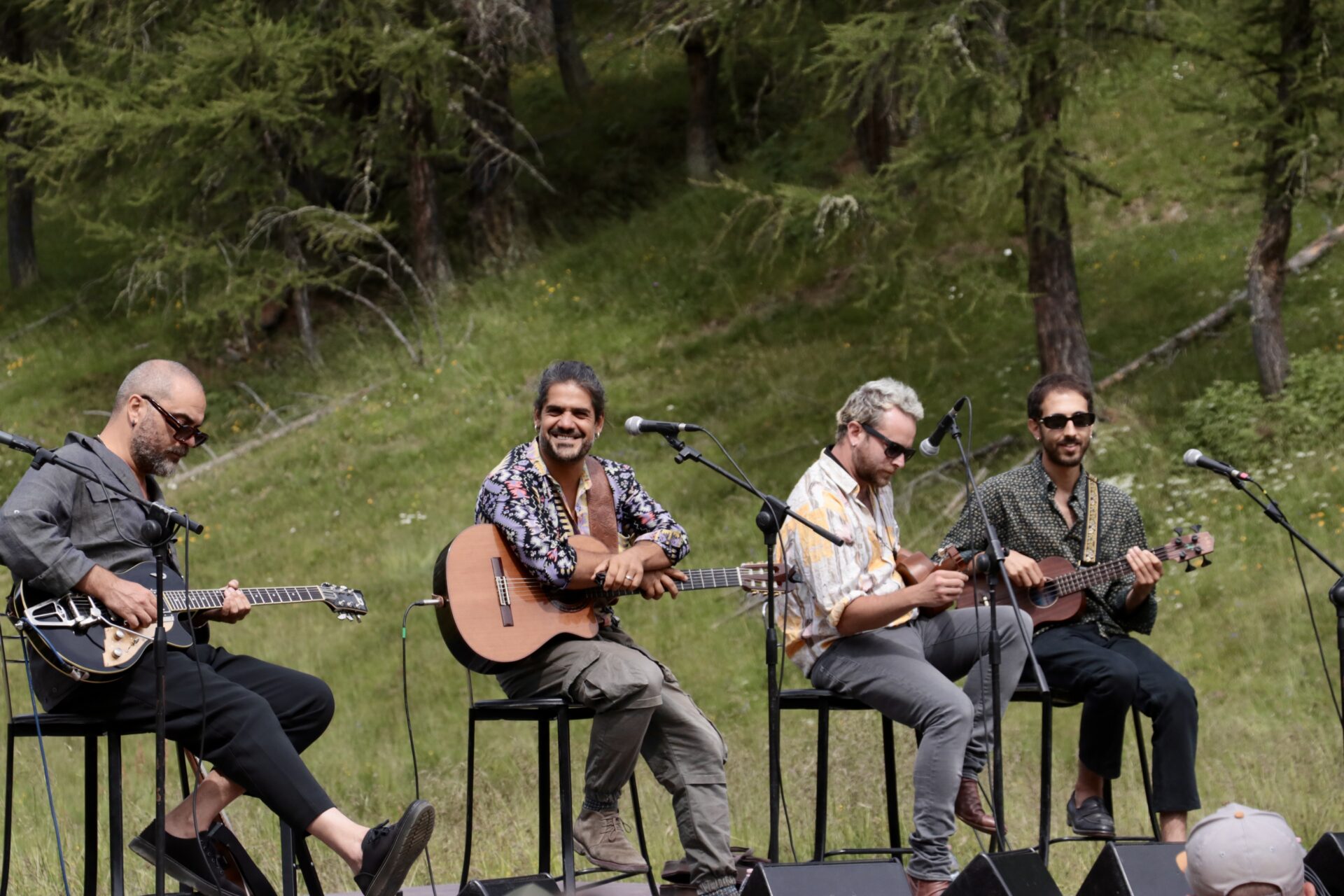 Il concerto comincia con calma, con l’arrivo sul palco di Mannarino accompagnato dai suoi tre compagni di tour e musicisti: Alessandro Chimenti, (basso e chitarra), Simone Alessandrini fiati (flauto traverso, sax, aerofono a tastiera) ed Emanuele Triglia (ukulele e chitarra). Tutti e quattro in occhiali da sole e camicia, prendono posizione con aria seria e salutano il pubblico cominciando a suonare Congo dall’album V, l’ultimo del cantautore. Dopo qualche incertezza e un contrattempo dovuto ad un problema di amplificazione, la musica lenta e le parole dense della canzone cominciano ad insinuarsi tra il pubblico risvegliando piano piano le emozioni.