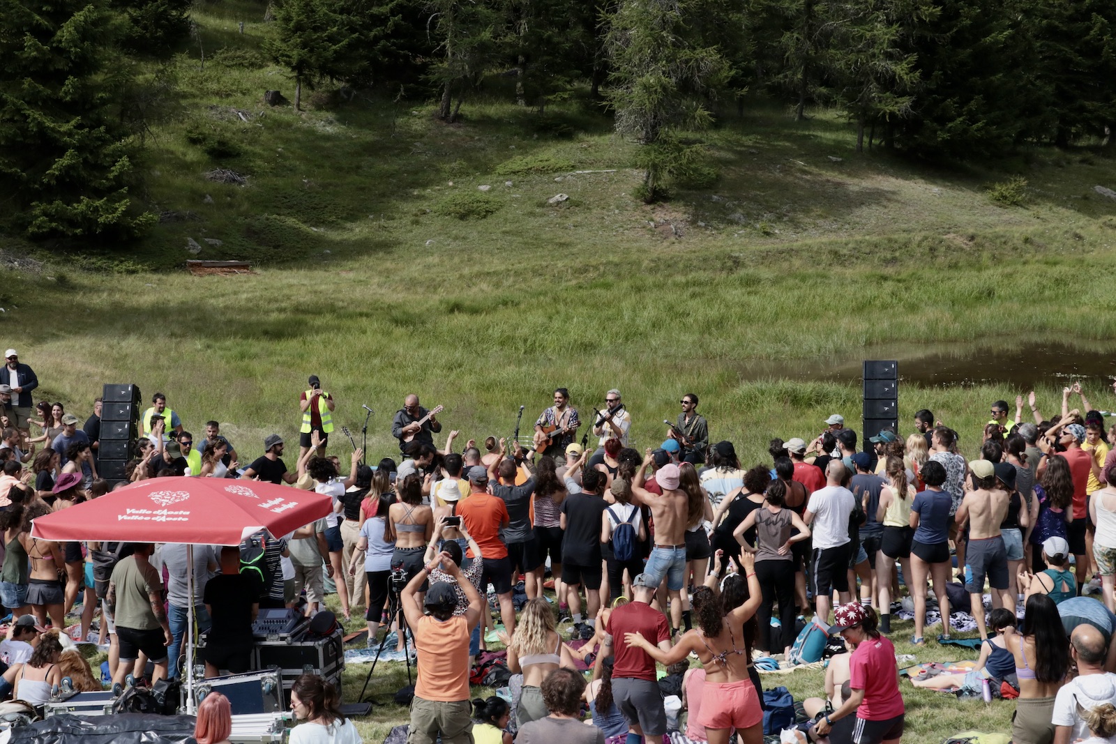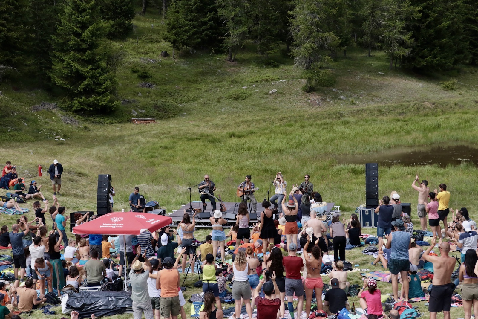 Arrivati al Col Pilaz, appena sopra il comune di La Magdeleine, davanti agli occhi si apre una piccola conca erbosa con un laghetto proprio al centro, mentre sullo sfondo svetta la punta inconfondibile del Cervino. È uno di quei posti tranquilli che si vivono in compagnia di qualche amico o da soli durante una passeggiata estiva, ma sabato pomeriggio, una volta superata la salita, lo spettacolo che si poteva ammirare era molto diverso: il prato era pieno di gente, tutti accampati a mo’ di anfiteatro attorno ad un piccolo palco nero, già pronto, con quattro sedie e nulla di più. Il concerto era quello del cantautore romano Mannarino per Musicastelle, la rassegna di concerti che porta la musica fuori dai palazzetti e in mezzo alla natura.