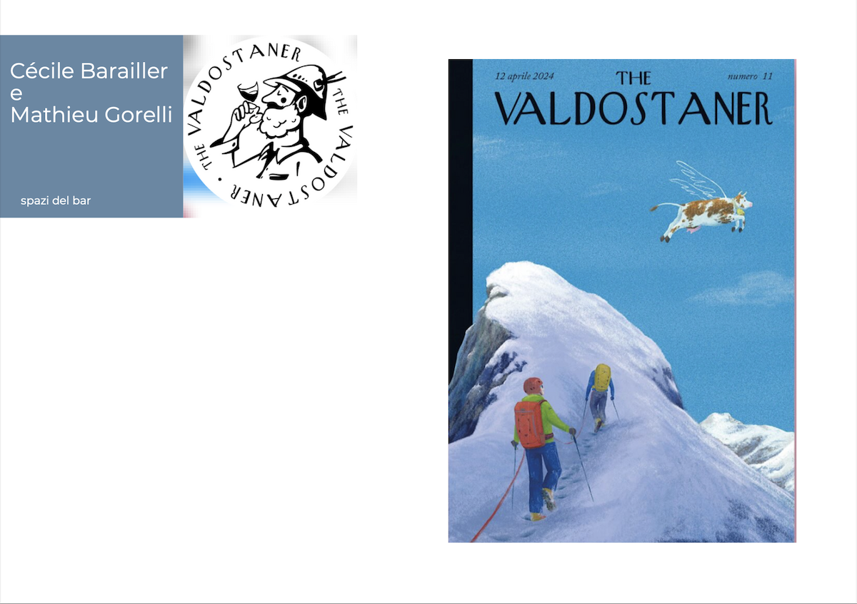 Ore 18.00 – Lancio di “The Valdostaner” presso la caffetteria degli spazi Plus (partner dell’evento) Inaugurazione del progetto grafico ispirato alla celebre rivista “The New Yorker” che viene reimmaginata graficamente nel progetto di Cécile Barailler e Mathieu Gorelli, in collaborazione con altri giovani artisti valdostani.