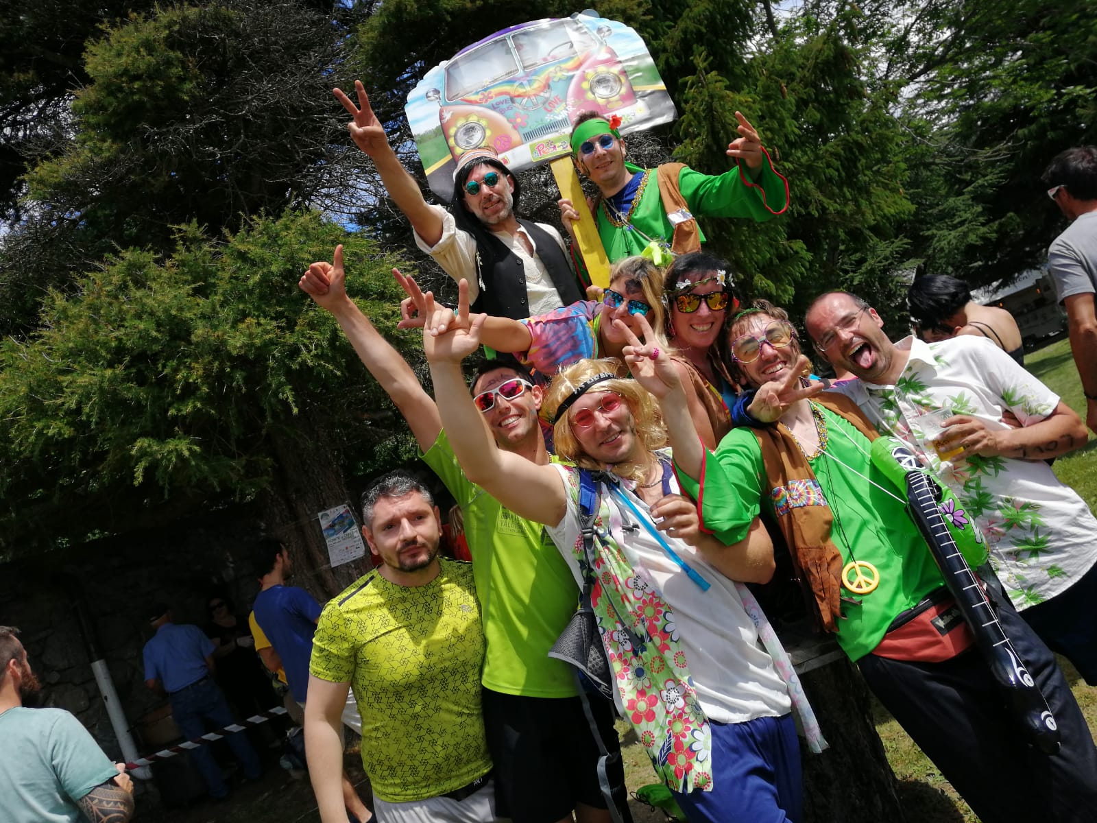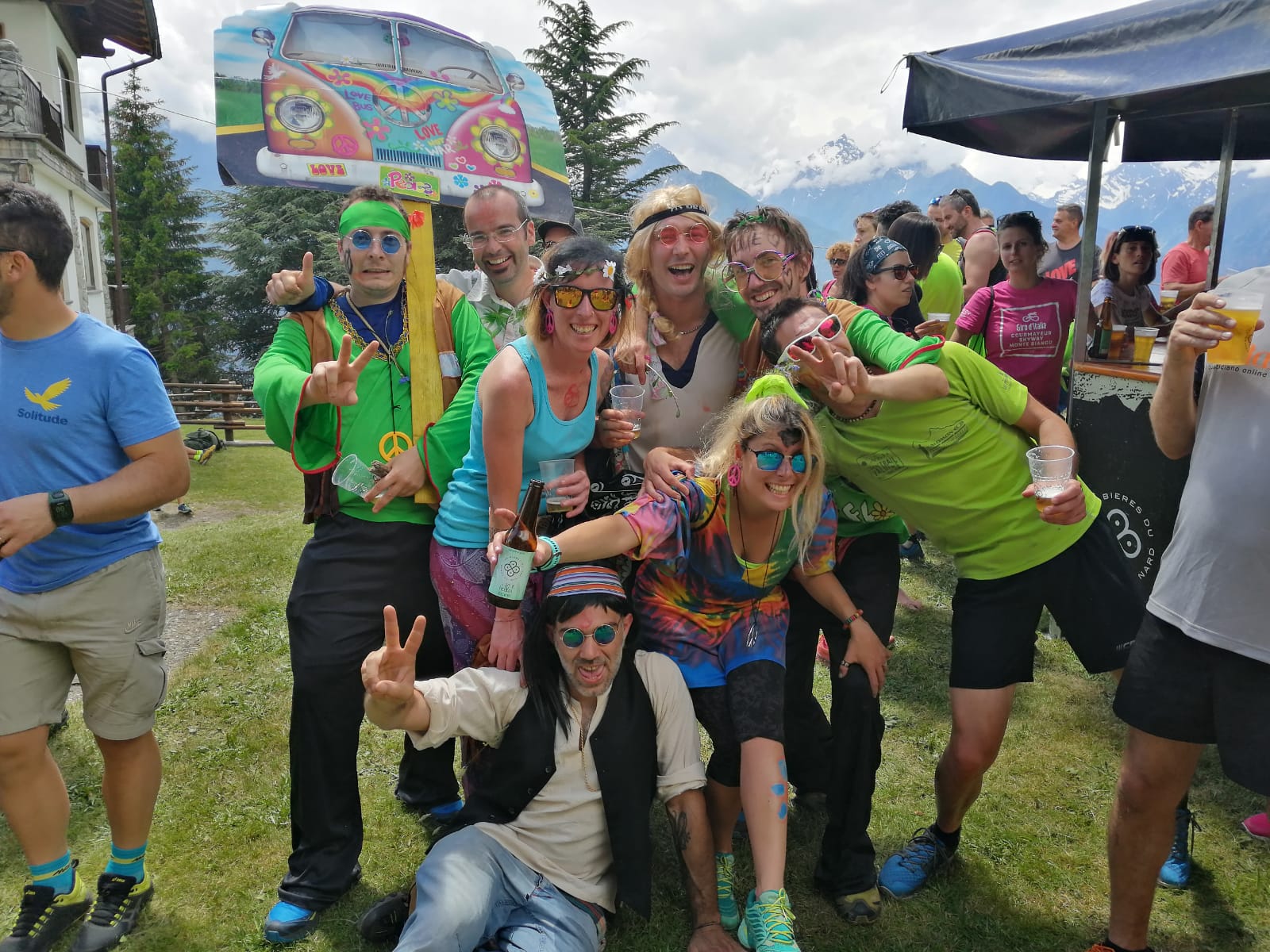 Insomma, se goliardia deve esserci non manca di certo ai partecipanti della Parimondet: dalla squadra rosa di Courmayeur Mont Blanc, ancora sulla scia del Giro d’Italia con tanto di bici rosa al seguito, ai pacifisti di Woodstock (pronti per l’edizione 2019 dell’Arrancabirra), passando per due “mezzalamisti” con sci e tute da sci alpinismo al seguito, fino ad arrivare alla coppia che ha vinto il premio simpatia, i novelli Adamo ed Eva, vestiti solo di foglie e ramoscelli, con l’immancabile serpente e la mela tentatrice. A partecipare anche la porta del bagno del Café du Vélo, ormai la più giramondo di Aosta, portata a quota 1340m da Marco Bernardi.
