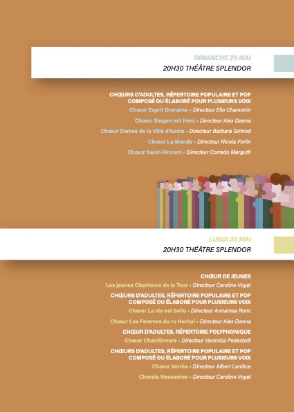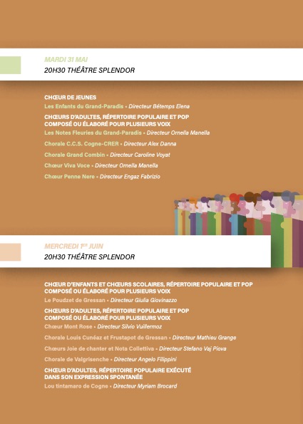 Les jeunes Chanteurs de la Tour, Chœur La vie est belle, Chœur Les femmes du ru Herbal, Chœur ChantEnvers, Chœur Verrès, Chorale Neuventse.