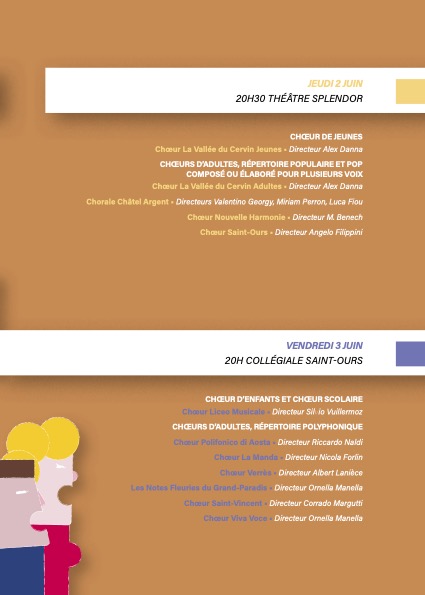 Chœur Liceo Musicale, Chœur polifonico di Aosta, Chœur La Manda, Chœur Verrès, Les notes Fleuries du Grand Paradis, Chœur Saint-Vincent, Chœur Viva Voce