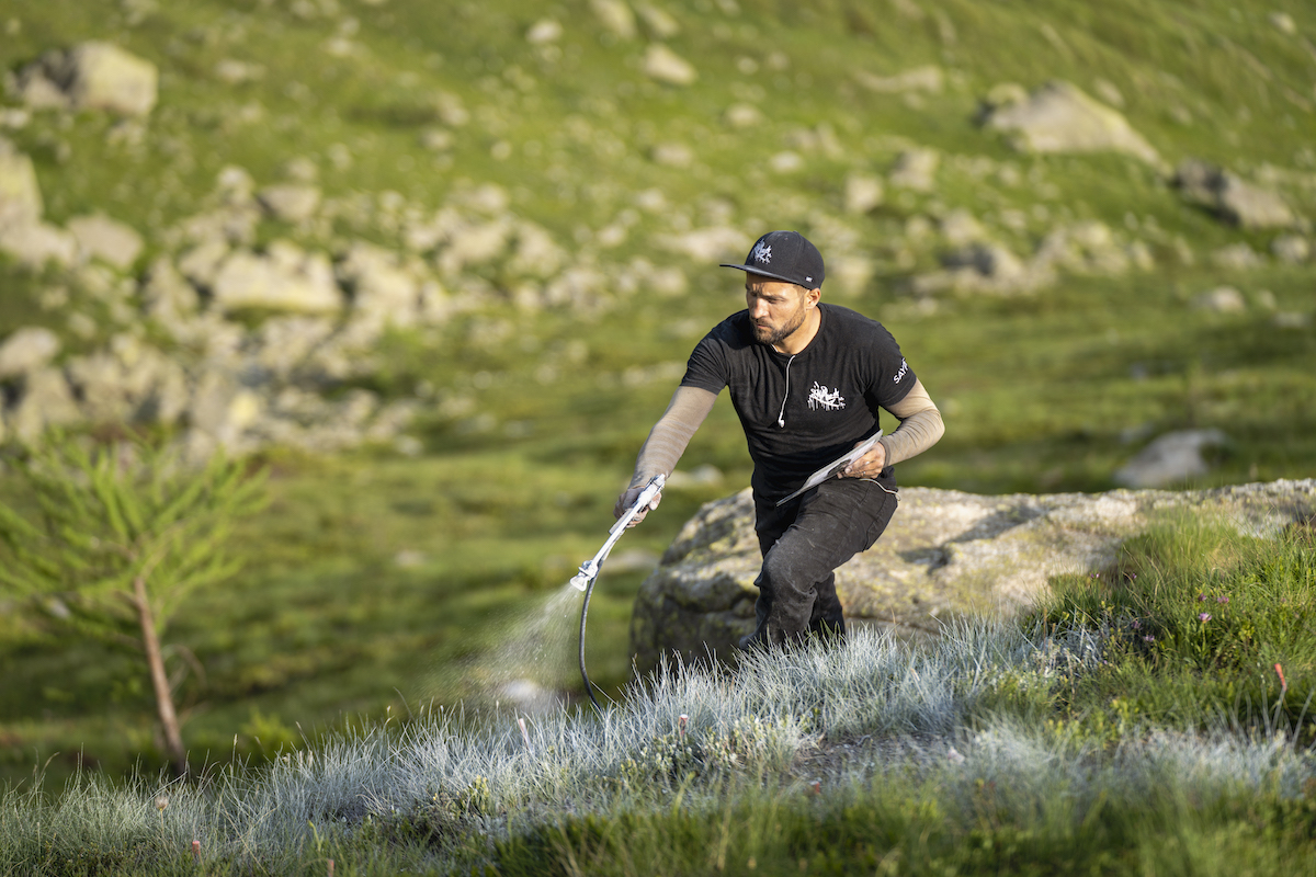 L’opera più alta di sempre dell’artista Saype è in Valle d’Aosta. L’artista franco-svizzero ha presentato questa mattina al Pavillon 2.173 il suo lavoro più recente, realizzato nei pascoli alpini sopra la stazione intermedia di Skyway Monte Bianco. Visibile solamente dall’alto, l’affresco sull’erba del Pavillon, intitolato “Une grande Dame”, rappresenta una nonna e la sua nipotina che guardano le montagne.