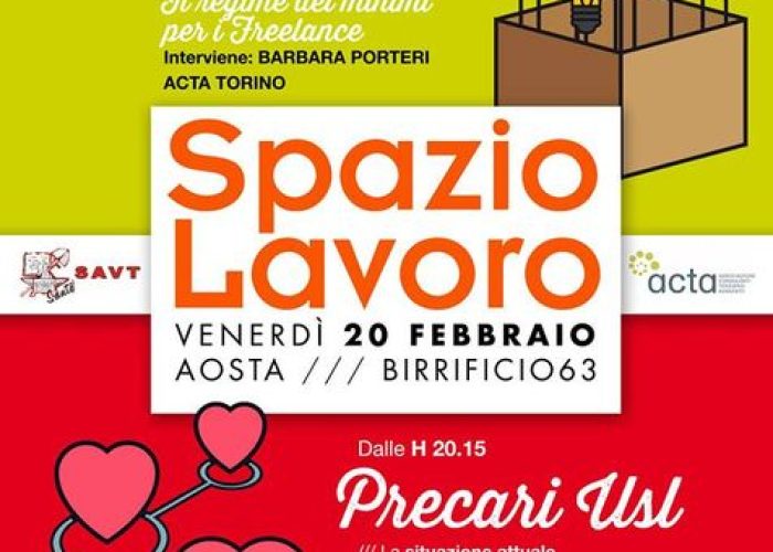I pro e i contro dei "Coworking" saranno al centro questo pomeriggio di un incontro al Birrificio B63 di Aosta organizzato da Acta – l’Associazione dei freelance. L’iniziativa, in programma alle 17.30, vedrà la partecipazione di Barbara Porteri di Acta Torino. Alle 20,15 il sindacalista del Savt Luigi Barailler e l’assessore alla Sanità Antonio Fosson parleranno di situazione attuale e delle prospettive per i precari dell’azienda Usl.