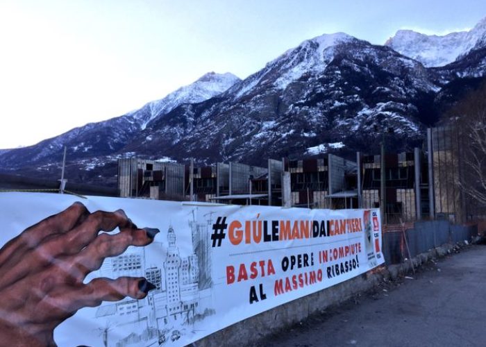 Con lo slogan #giulemanidaicantieri la Cgil settore edili oggi in tutta Italia accende i riflettori sulla crisi del settore e sulla proposta di legge di iniziativa popolare in materia di appalti promossa dalla Cgil. In Valle d’Aosta la protesta si è svolta questa mattina alle 6 all’aeroporto Corrado Gex di Aosta dove è stato issato un enorme striscione.