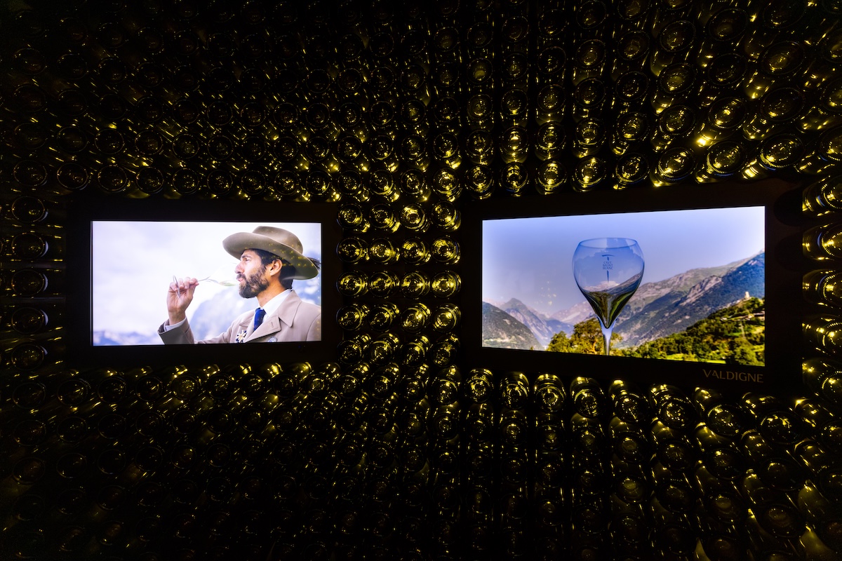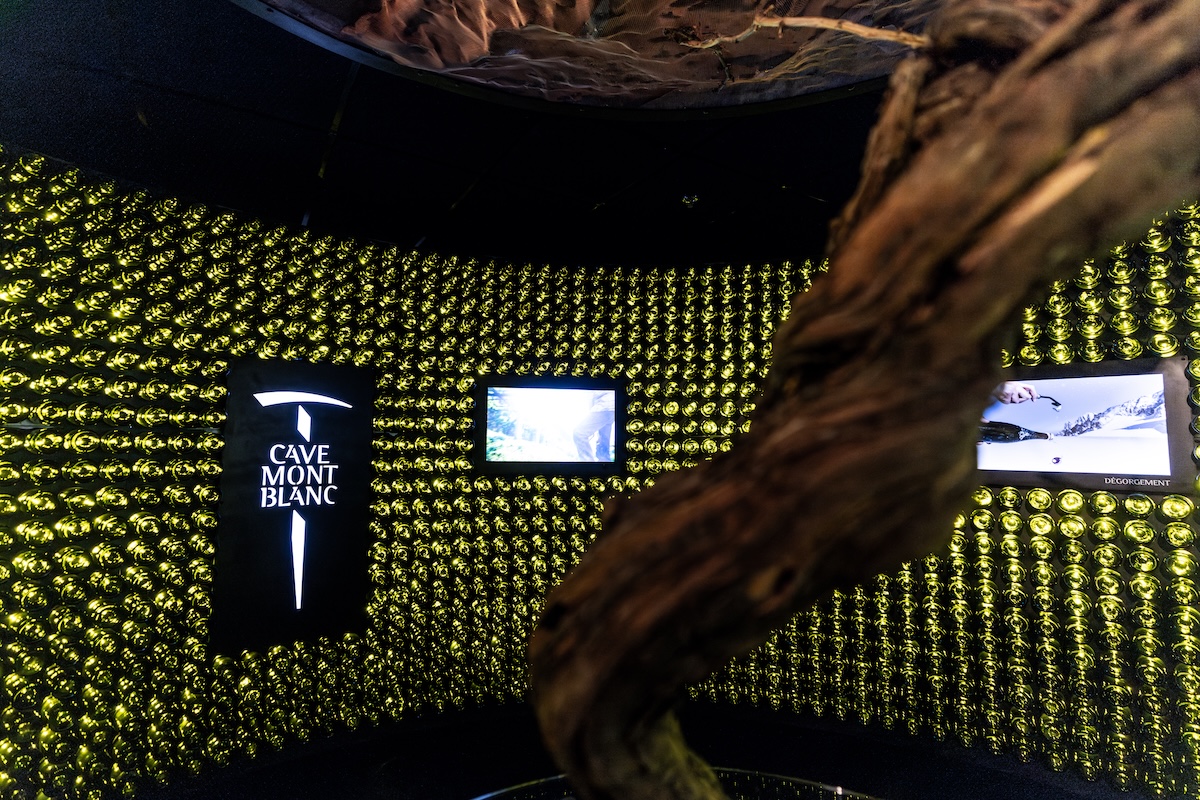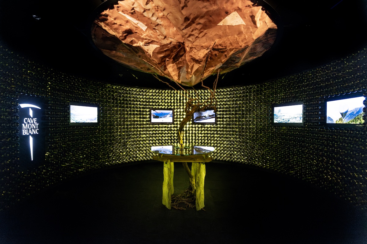 La nuova cantina sperimentale del Pavillon – si legge in una nota – “è un invito a celebrare l’altezza e a superare i limiti, un percorso coinvolgente che racconta la storia eccezionale delle bollicine dei ‘ghiacciai’, che ospita al centro una parete di riciclo di circa 3.000 bottiglie recuperate dopo l’utilizzo a Skyway Monte Bianco e l’opera artistica lo Blanc di Blanc, realizzata dall’artista del ferro di Morgex Michel Olmi, dove la vetta del Monte Bianco incornicia le vigne e contribuisce a rendere così unici i vini di Cave Mont Blanc”.
