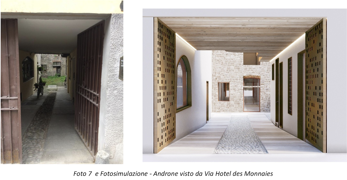 Nell’androne tra via Hôtel des Monnaies e la “capsula”, “un portone in acciaio corten con forature irregolari” sostituirà l’attuale ingresso, ovvero il portone metallico con le iniziali “MF” che si affaccia sulla strada. All’interno, “la pavimentazione dell’androne e della corte verrà rifatta seguendo l’impostazione esistente, con due fasce laterali e ciottolato di fiume nella porzione centrale”, prevedendo però “di sostituire il cemento attuale delle fasce con lastroni di pietra e di proseguirli fino all’edificio da recuperare”.