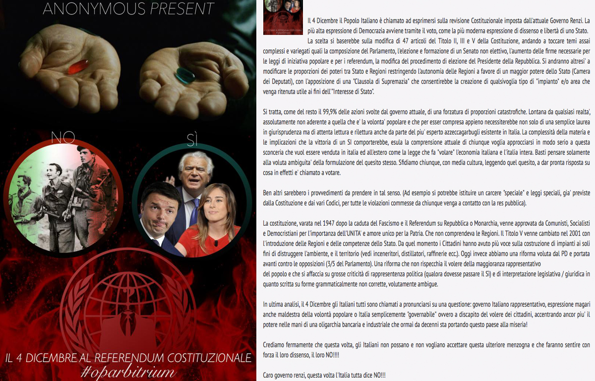 Il lungo articolo inserito a forza nel sito del Pd – ridefinito da Anonymous "Partito delle Cazzate Democratiche" – e accompagnato dall’hashtag #OpArbitrium, entra nel merito della riforma, definita “una forzatura di proporzioni catastrofiche, lontana da qualsiasi realtà, assolutamente non aderente a quella che è la volontà popolare e che per esser compresa appieno necessiterebbe non solo di una semplice laurea in giurisprudenza ma di attenta lettura e rilettura anche da parte del più esperto azzeccagarbugli esistente in Italia”, per poi esortare gli italiani a far "sentire con forza il loro dissenso", votando NO.