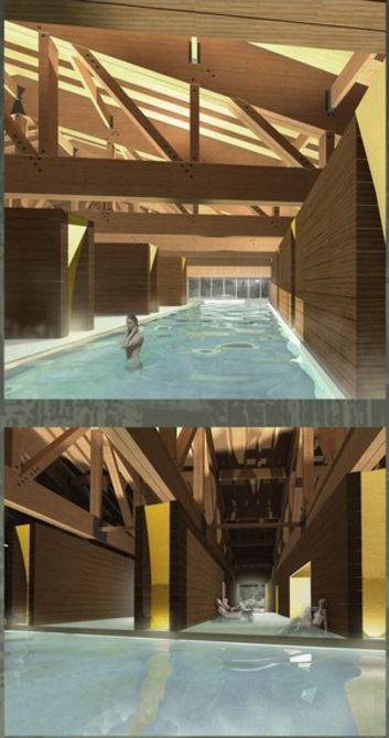 “Il Palazzetto del Ghiaccio – spiega l’architetto Daniele Geltrudi – è oggi un immenso salone la cui copertura è sostenuta da una spettacolare carpenteria lignea di capriate da 40 metri. La nostra proposta valorizza le capriate appoggiandovi delle libere pareti di legno trasversali con le quali identificare gli spazi funzionali richiesti dal bando: un ambiente termale, una palestra, una sala convegni, una hall di accoglienza e distribuzione, la sistemazione dell’esterno: la strada lungo il torrente Evancon e il giardino-boschetto sul lato opposto“
