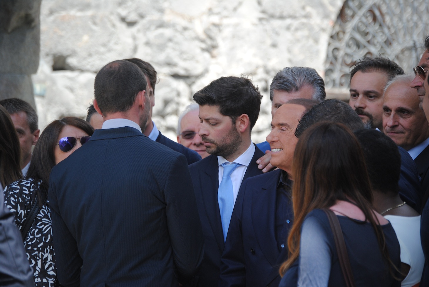 La mattina ha regalato al Presidente di Forza Italia l’abbraccio della città, accalcatasi per incontrarlo, e lui non si è fatto certo negare tra strette di mano, selfie con simpatizzanti e ammiratori, ed un souvenir “particolare” regalatogli in un negozio, un bavaglino da bebè con sopra ricamata la scritta “Per baciarmi mettetevi in fila… Grazie!”. Da qui la sfilata sotto le Porte Pretoriane, accompagnato dai 26 candidati alla sfida elettorale di domenica, un passaggio di fronte al teatro Romano – per il quale l’ex premier ha insistito per pagare il biglietto d’ingresso – e l’arrivo in piazza Chanoux, prima di pranzare con i candidati al Duca d’Aosta.