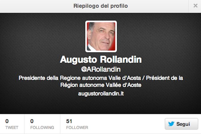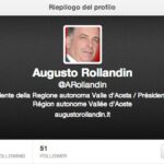 L’ultimo, in ordine di tempo, a "cedere" alla tentazione dei social, è stato ieri, venerdì 28 dicembre, il Presidente della Regione Augusto Rollandin che in un primo ed unico cinguettio (per ora) ha annunciato l’alleanza dell’Uv con le forze autonomiste, Stella Alpina e Fédération, per le politiche di febbraio e l’abbandono del Pdl. In poche ore dall’annuncio Rollandin ha conquistato già più di 220 followers.
