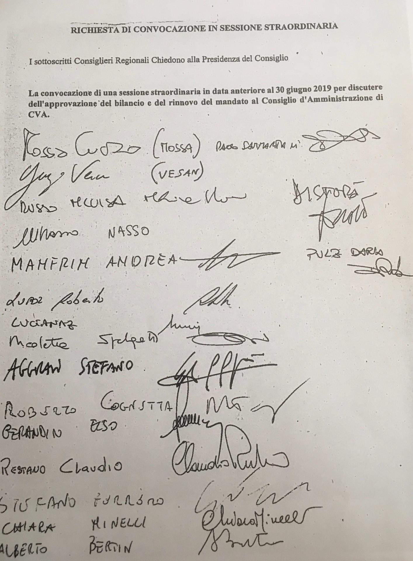 Diciotto firme – MoVimento 5 stelle, Lega, Mouv’, Rete Civica, Adu e Claudio Restano (Misto) – per ottenere prima del 30 giugno un Consiglio regionale straordinario per discutere l’approvazione del bilancio e del rinnovo del mandato al Consigli di amministrazione di Cva.